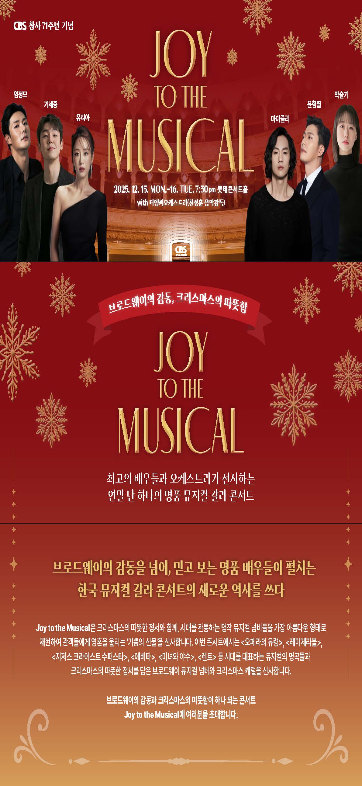 브로드웨이의 감동을 넘어, 믿고 보는 명품 배우들이 펼치는 한국 뮤지컬 갈라 콘서트의 새로운 역사를 쓰다. Joy to the Musical은 크리스마스의 따뜻한 정서와 함께, 시대를 관통하는 명작 뮤지컬 넘버들을 가장 아름다운 형태로 재현하여 관객들에게 영혼을 울리는 '기쁨의 선물'을 선사합니다. 이번 콘서트에서는 <오페라의 유령>, <레미제라블>, <지저스 크라이스트 수퍼스타>, <에비타>, <미녀와 야수>, <렌트> 등 시대를 대표하는 뮤지컬의 명곡들과 크리스마스의 따뜻한 정서를 담은 브로드웨이 뮤지컬 넘버와 크리스마스 캐럴을 선사합니다.