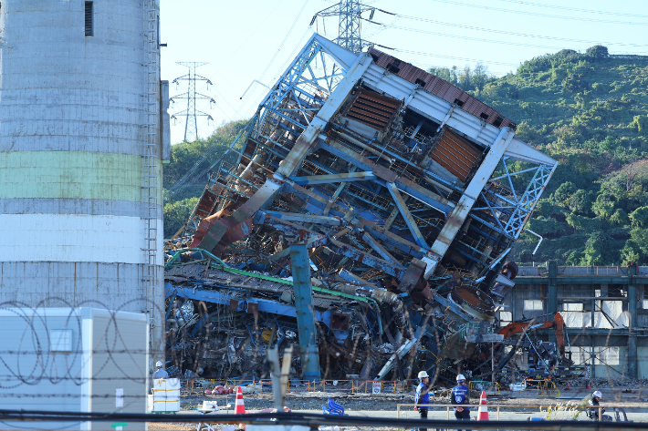 [사진: 10일 오후 울산화력발전소 보일러 타워 붕괴 현장 모습. 연합뉴스]