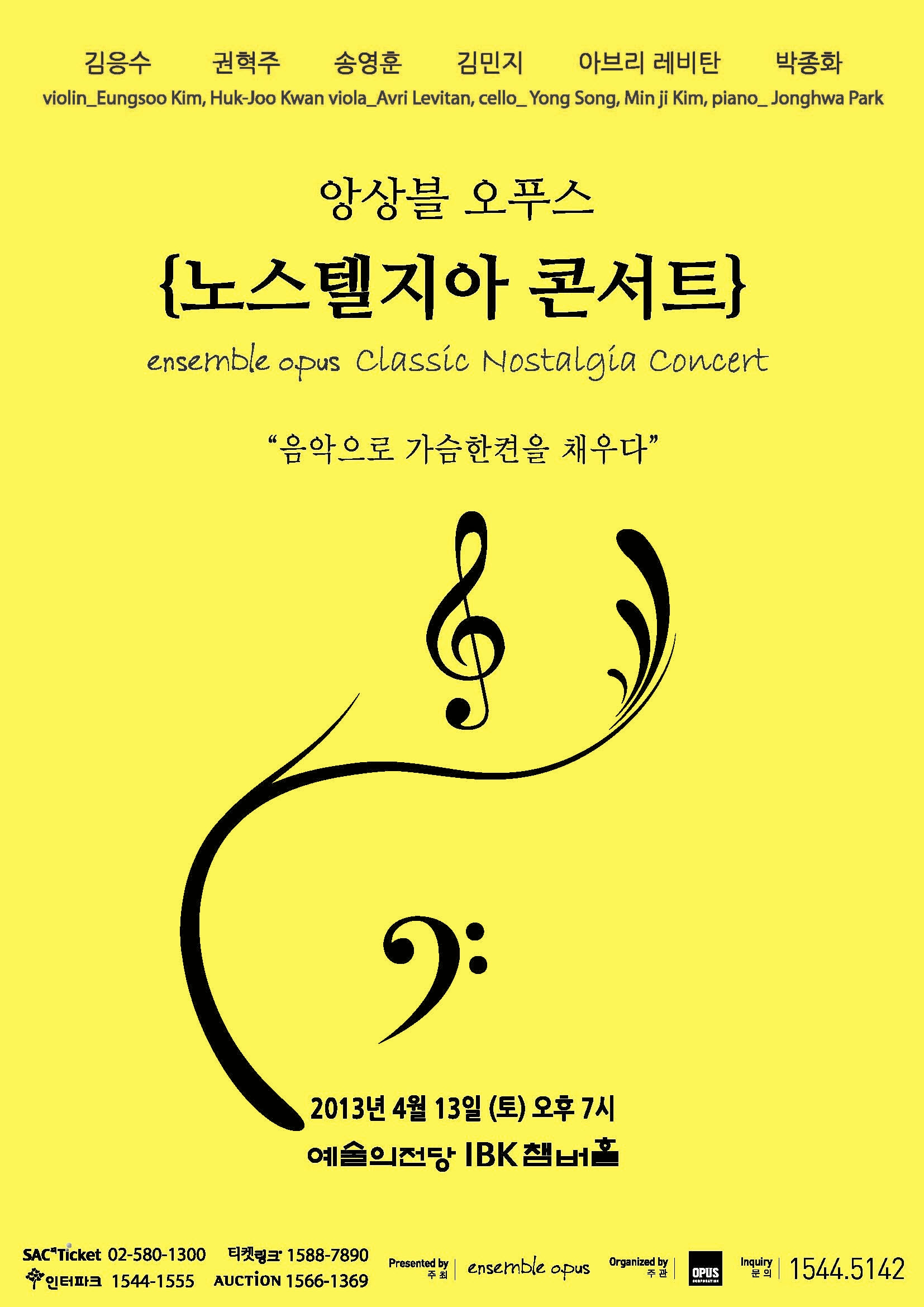 2013 앙상블 오푸스 클래식 노스텔지아 시리즈의 첫 번째 공연이 열립니다. 이번 앙상블 오푸스의 연주에서는 세계 콩쿨을 휩쓸고 유럽의 차세대 바이올리니스트로 손꼽히는 김응수와 권혁주, 2009 BBC Music Magazine Awards nominee의 빛나는 앙상블 오푸스의 비올리스트 Avri Levitan과, 클래식음악의 전령사 첼리스트 송영훈, 로린 마젤이 이끄는 스페인 레이나 소피아 오케스트라 부 수석으로 활동 하였던 첼리스트 김민지 마지막으로 보스턴 글로브지로부터 “불멸의 거장 스비아토슬라브 리히터를 능가” 한다는 평가를 받은 피아니스트 박종화까지 국내 외 최고의 솔리스트가 환상적인 하모니를 선사합니다.