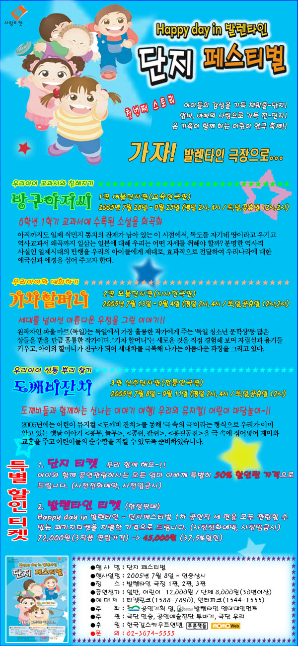 7월 8일부터 대학로 발렌타인 극장 1,2,3관에서 <도깨비 잔치>를 시작으로 <기차할머니>, <방구아저씨>등의 연극 작품이 연속으로 공연됩니다.