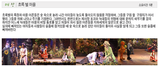 노래와 춤, 그리고 단순히 구경하는 차원이 아니라 게임과 다양한 놀이로 극적 재미와 교훈이 있는 무한한 상상력의 세계로 어린이들을 초대합니다.