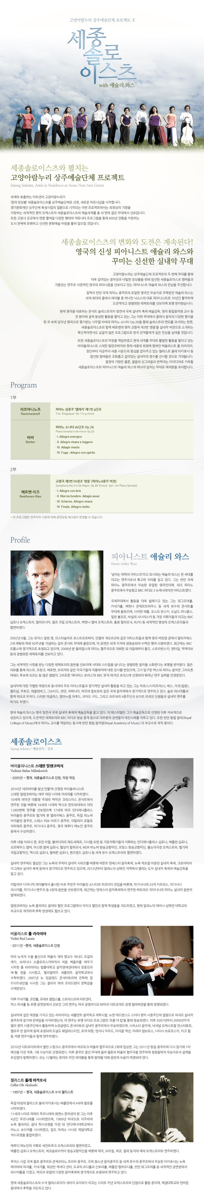 지난 7월, 세계적인 바이올리니스트 바딤 레핀과 함께 한 완성도 높은 첫 공연을 통해 공연장과 연주단체의 이상적인 협업 사례로 문화예술계의 찬사를 받는 고양아람누리와 세종솔로이스츠는 두 번째 무대에서 깊이있는 작품해석과 기품있는 연주로 우아하고 서정적인 영국 피아니즘을 선보이는 피아니스트 애슐리 와스와 세종솔로이스츠 가운데서도 엄선된 멤버인 바이올리니스트 스테판 밀렌코비치와 비올리스트 폴 라라이아, 첼리스트 올레 아카호시의 실내악 무대를 공개한다. 절정의 기량을 갖춘 것은 물론, 끊임없는 변화와 도전을 시도하며 오늘날 세계무대에서 활발하게 활동하는 젊은 음악가들이 한자리에 모여 서로의 에너지를 증폭시키는 현장이 될 것으로 기대를 모은다.
