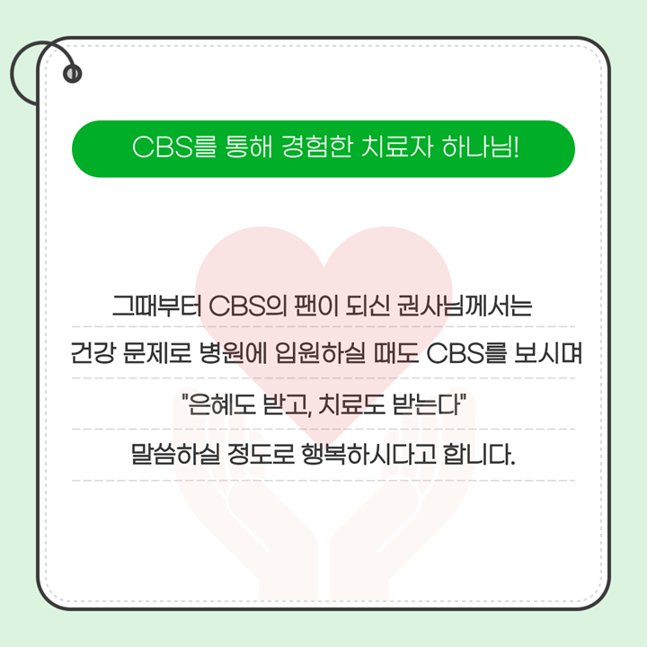 그때부터 CBS의 팬이 되신 권사님께서는 건강 문제로 병원에 입원하실 때도 CBS를 보시며