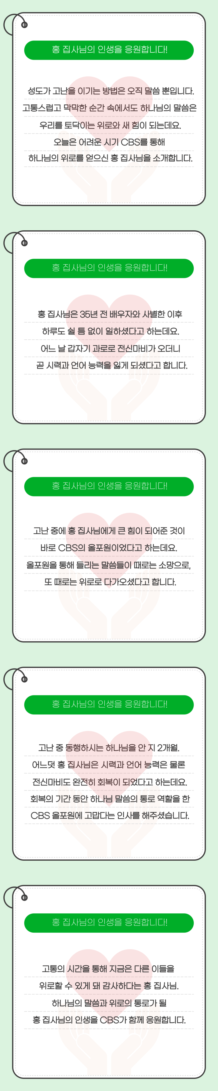 오늘은 어려운 시기 CBS를 통해 하나님의 위로를 얻으신 홍 집사님을 소개합니다.