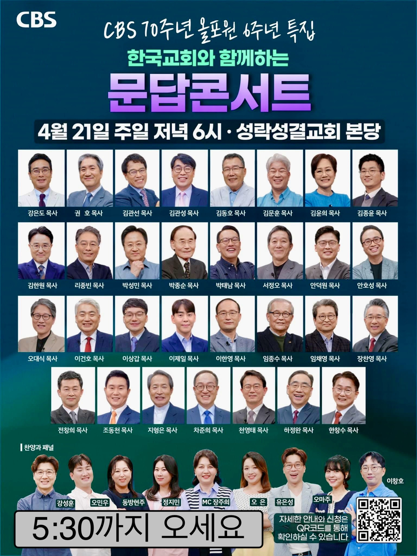 아름다운 4월의 주일 저녁, 목회자 서른 명과 한국교회 성도들이 함께하는 역대급 문답콘서트가 개최된다. 일상에서 부딪히는 신앙의 문제를 머리를 맞대고 풀어온 올포원이 CBS 70주년과 올포원 6주년을 기념하며 마련한 자리로, 올포원 애청자들과 한국교회 성도들을 초대하는 특집 공개방송이다.