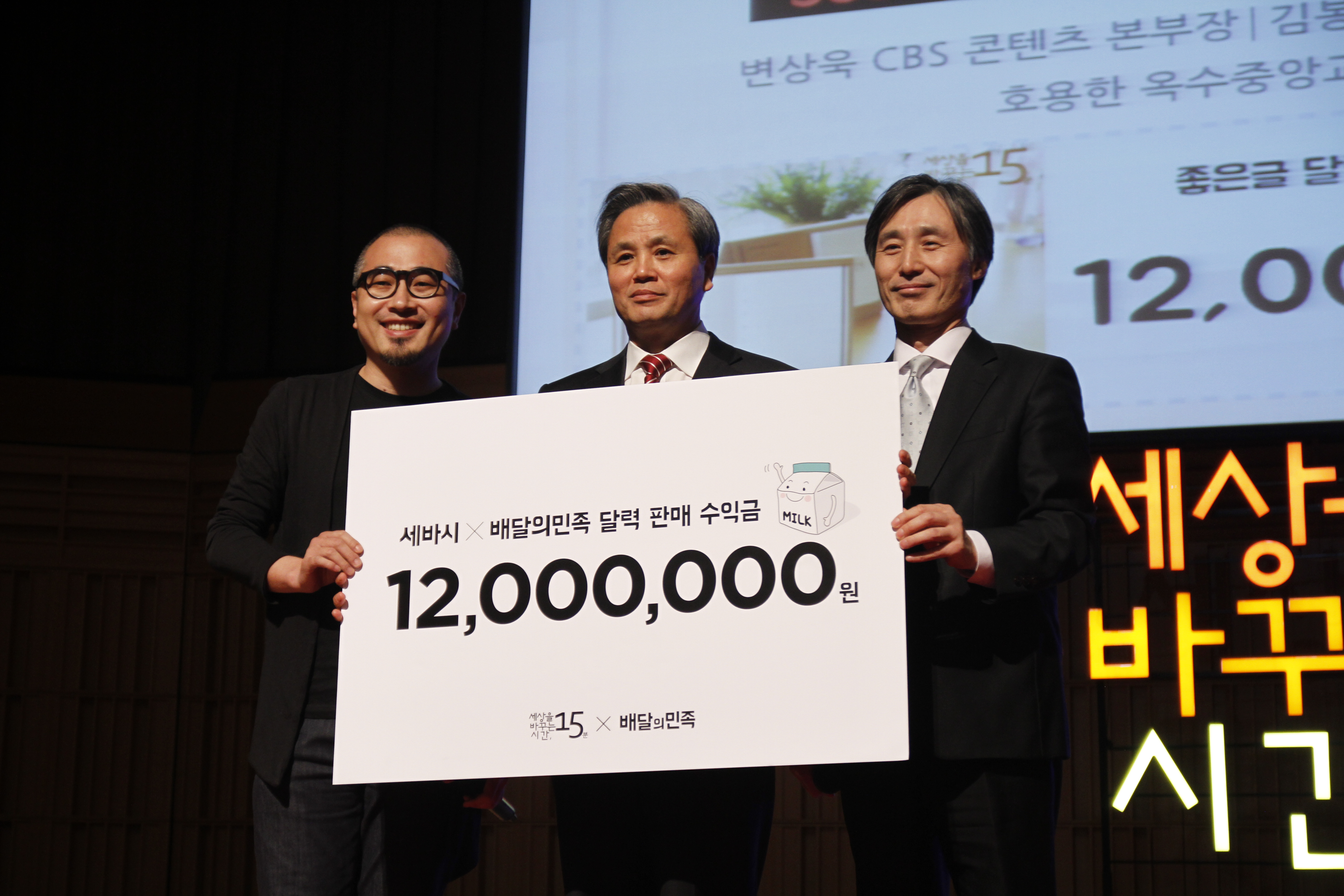 이날은 강연에 앞서 특별한 세리모니가 진행됐다. 배달음식앱으로 유명한 ‘배달의민족’ 개발사인 ‘우아한형제들’과 ‘세바시’가 지난해 연말 이른바 ‘공익적 콜라보레이션’으로 함께 만든 ‘2015 세바시 좋은글 달력’의 판매 수익금 1,200만원 전액을 독거노인돕기 캠페인에 전한 것.