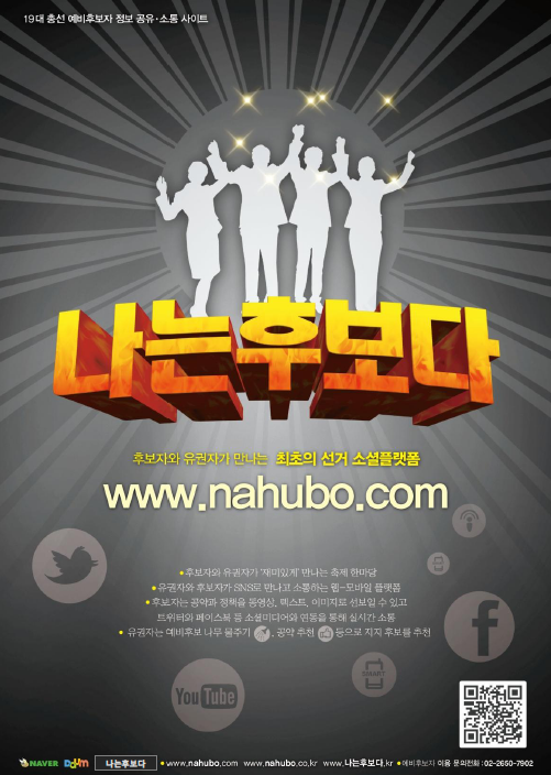 ‘나후보 닷컴’은 총선을 통해 꿈을 펼칠 예비후보들이 자신의 정치적 포부와 공약 등을 알리고 트위터와 페이스북 등과 연동 서비스를 제공해 SNS 시대 후보자와 유권자가 실시간 소통하는 최초의 선거 소셜 플랫폼이다.