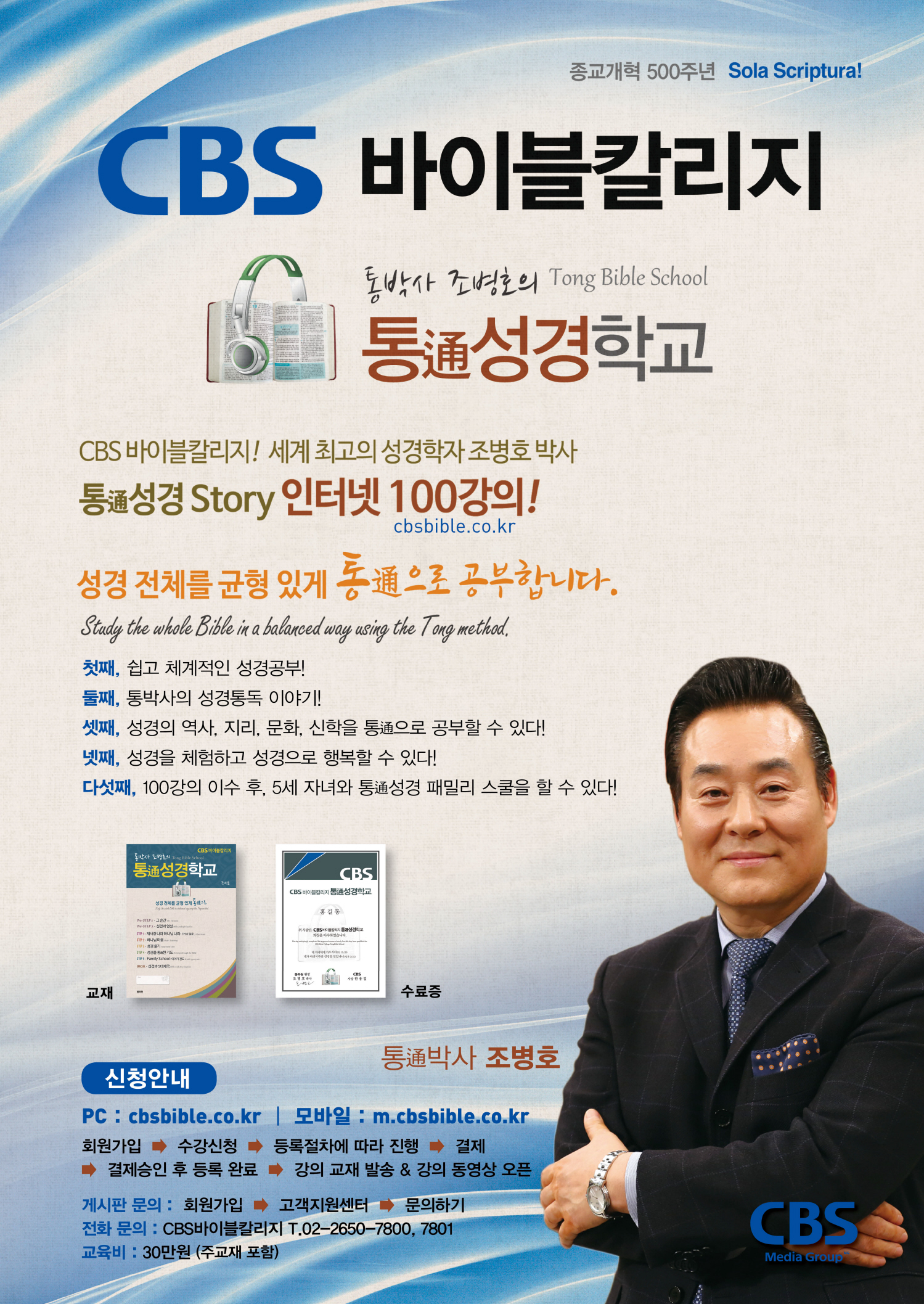 CBS와 통독원은 2017년 종교개혁 500주년을 맞아 한국교회가 ‘오직 성경으로’ 다시 돌아가 성경을 깊이 있게 배우고, 지성과 영성을 겸비한 크리스천의 삶을 더욱 풍성하게 하기 위해 바이블칼리지를 개원한다고 밝혔다. CBS 바이블칼리지 ‘통박사 조병호의 통通성경학교’는 9월 1일 정식 개강한다.