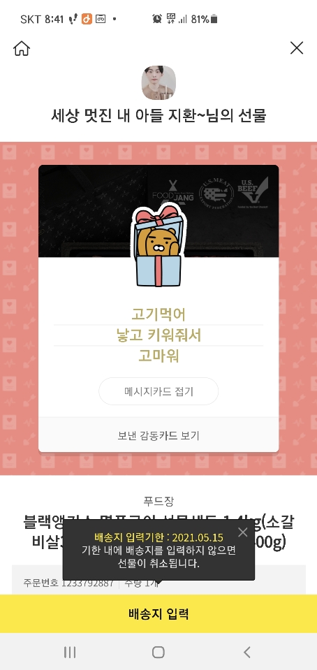 오늘 그 아들에게서 카톡 선물을 받았어요...