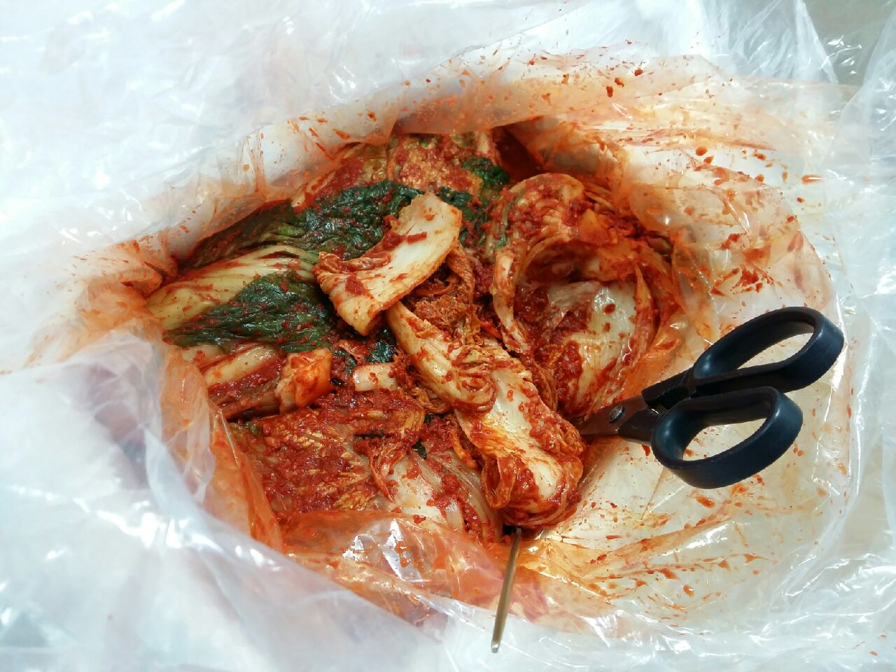 김치통에 옮겨 담아야하는데 김치 매콤하니 너무 맛나서 한포기 가위로 잘라 파먹고 있어요.(0465)