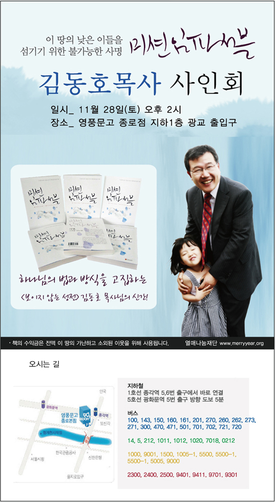 한편, 11월28일(토) 오후 2시 종로 영풍문고 지하1층 광교 출입구에서 김동호 목사의 사인회가 진행될 예정이다. 책의 모든 수익금 전액은 이 땅의 가난하고 소외된 이웃들을 위해서 사용된다. 많은 시민들의 관심 부탁드립니다.