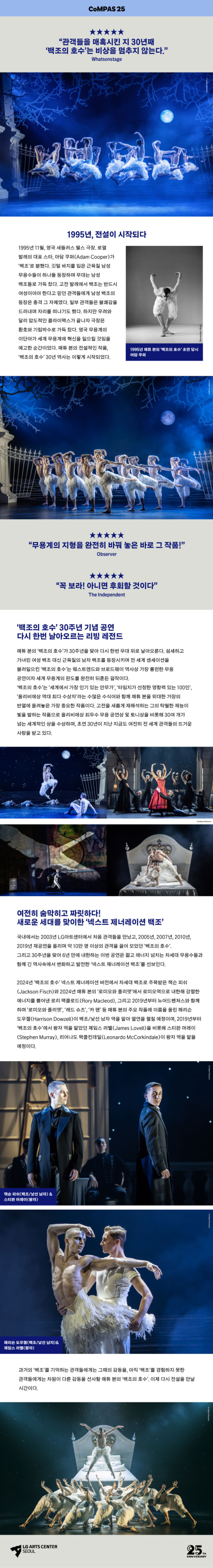 국내에서는 2003년 LG아트센터에서 처음 관객들을 만났고, 2005년, 2007년, 2010년, 2019년 재공연을 올리며 약 10만 명 이상의 관객을 끌어 모았던 '백조의 호수' 그리고 30주년을 맞아 6년 만에 내한하는 이번 공연은 젊고 에너지 넘치는 차세대 무용수들과 함께 긴 역사속에서 변화하고 발전한 '넥스트 제너레이션 백조'를 선보인다.