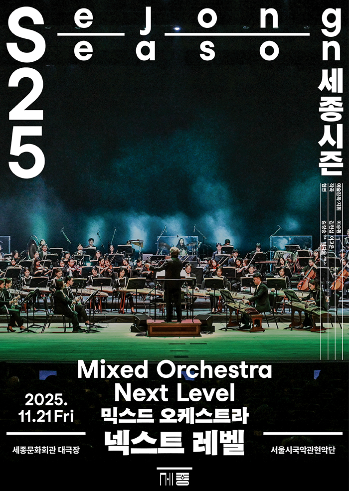 세종문화회관(사장 안호상)은 오는 11월 21일(금) 대극장에서 서울시국악관현악단의 믹스드 오케스트라 <넥스트 레벨>을 선보인다. ‘믹스드 오케스트라’는 국악관현악을 중심으로 서양악기, 전자음향 등 다양한 소리를 결합해 한국형 오케스트라의 새로운 가능성을 탐색해온 프로젝트다. 2022년 첫 선을 보인 이후 세 차례의 공연을 거치며, 서울시국악관현악단의 대표 레퍼토리로 자리매김했다. 이번 공연은 이승훤 단장이 지휘를 맡아 새 시즌의 포문을 여는 무대이며, 우리 음악의 전통을 지키면서도 동시대적 감각으로 재해석해 국악관현악단의 새로운 방향을 제시한다. 김정승(단소, 서울대학교 교수), 박다울(거문고)이 협연자로 함께한다.
