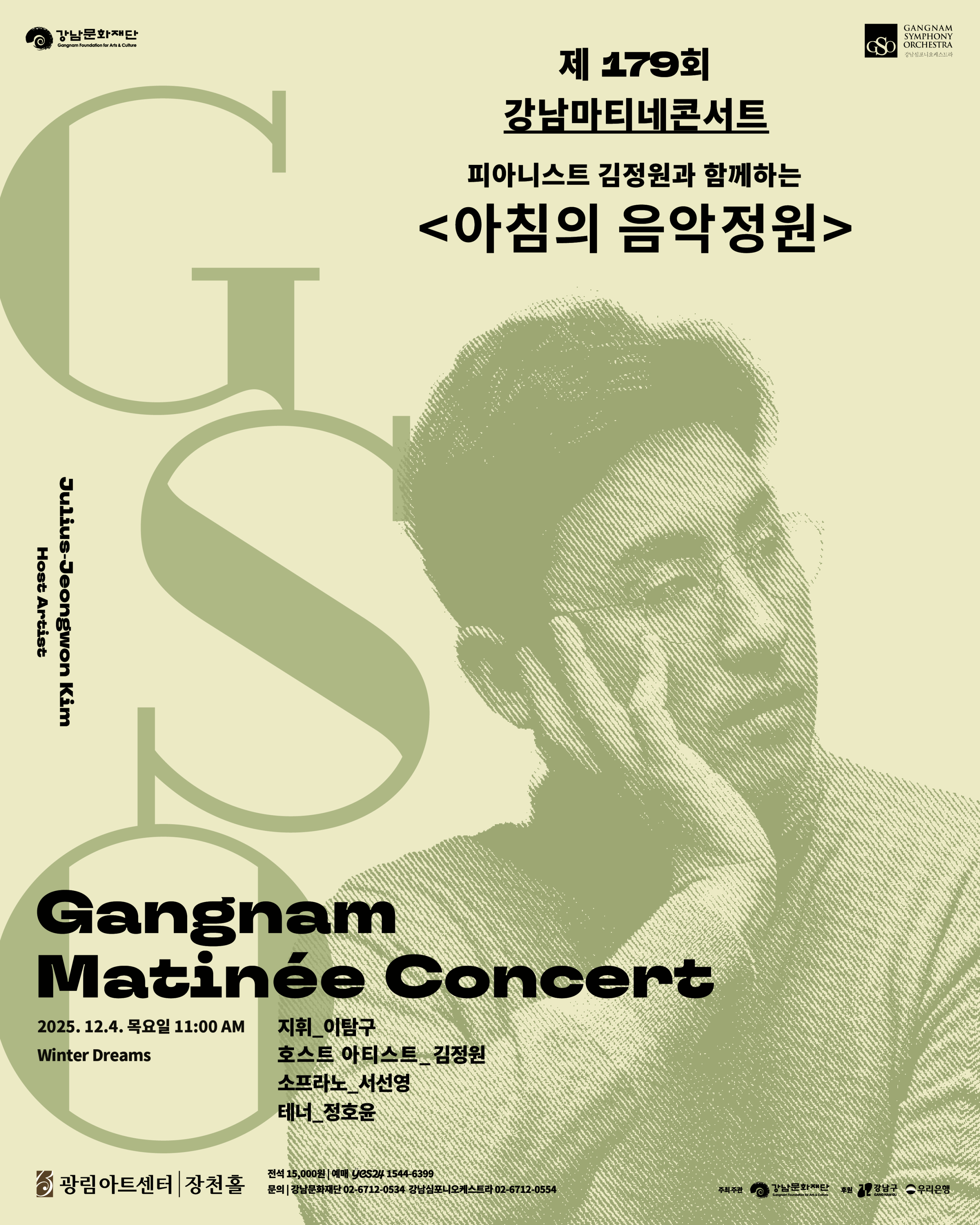 강남심포니오케스트라(이하 강남심포니)가 오는 12월 4일(목) 오전 11시에 광림아트센터 장천홀에서 제179회 <강남마티네콘서트>를 개최한다. 클래식 음악의 대중화를 위한 해설형 콘서트로 자리 잡은 <강남마티네콘서트> 179회에서는 ‘겨울날의 꿈(Winter Dreams)’라는 주제로 꾸며지며, 지휘자 이탐구(강남심포니 부지휘자)와 소프라노 서선영, 테너 정호윤 그리고 호스트 아티스트 김정원이 함께한다.