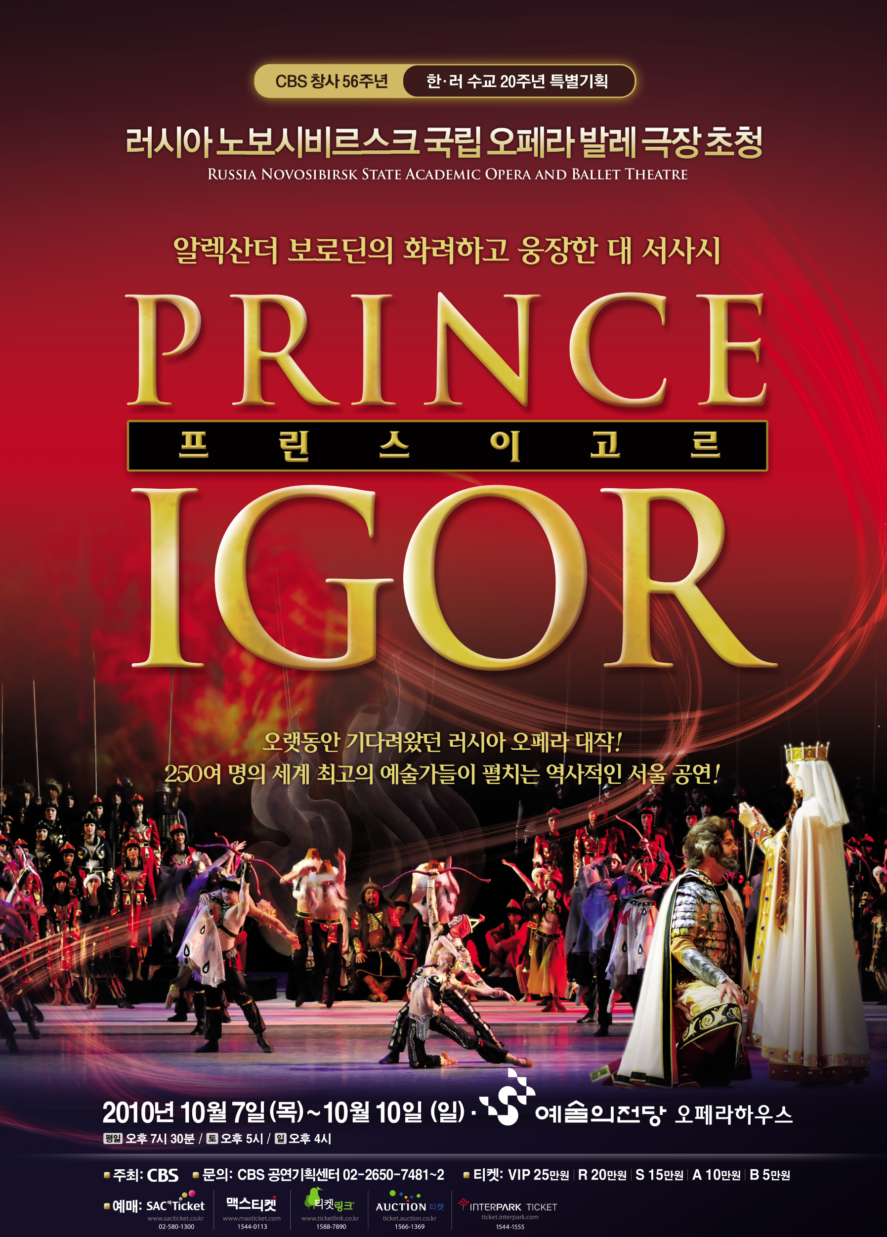 러시아 예술을 총망라한 오페라 대작 총250여 명의 성악가, 합창단, 발레단, 오케스트라, 스태프 ! 그 명성을 확인 할 수 있는 대형 러시아 오페라 프로덕션의 내한 그동안 엄두를 낼 수 없었던 보로딘의 명작 ‘Prince Igor’ 프린스 이고르’ 공연일시 : 2010년 10월 7일(목) ~ 10월 10일(일) 평일 오후 7시30분 / 토 오후 5시 / 일 오후 4시 공연장소 : 예술의 전당 오페라하우스 티켓가격 : VIP석 250,000원 R석 200,000원 S석 150,000원 A석 100,000원 B석 50,000원 예매처 : 인터파크 1544-1555 / SAC티켓 580-1300 공연문의 : CBS공연기획센터 2650-7480~2 러시아 노보시비르스크 국립오페라발레극장에 의해 새롭게 탄생한 오페라 <프린스 이고르> ! 성악, 합창, 오케스트라, 발레, 드라마, 무대 미술, 조명 등 러시아 공연예술의 정수를 보여준 최고의 프로덕션! 몇 명의 솔리스트와 제작진만이 오는 경우가 대부분이었던 지금까지의 해외 오페라단 내한공연과는 달리 지난해 130여 명이 내한, <카르멘>에서 놀라운 예술성을 보여주며 관객들의 기립박수를 받았던 노보시비르스크 국립오페라발레극장이 올해에는 더 큰 규모로 내한하여 러시아 오페라 미학을 집대성한 작품 <프린스 이고르>로 찾아온다. 볼쇼이, 마린스키 극장과 더불어 러시아 3대 국립극장으로 유명한 노보시비르스크 국립오페라발레극장의 프로덕션으로 선보일 보로딘(Alexander Porfiryevich Borodin,1833~1887)의 오페라 <프린스 이고르>는 러시아 최고의 스태프들이 참여, 성악가와 합창단, 발레단, 지휘자, 오케스트라 수석 단원들이 내한 총 250여 명의 예술가들이 한자리에 모여 펼치는 대규모 프로젝트이다. 그동안 보기 힘들었던 이번 서울공연은 16년 만에 올려질 정도로 좀처럼 엄두를 낼 수 없었던 작품이기도 하다. 12세기 러시아 건국시대에 있었던 노브고로도의 공작 이고르가 남방의 초원지대에 나타난 유목민족 폴로베츠인과 싸우는 애국적인 것으로 보로딘이 대본도 직접 썼는데, 그의 개성이 가장 강하게 발휘된 <프린스 이고르>는 십 수년에 걸쳐 작곡되었고 미완성이었던 이 작품은 림스키 코르사코프와 그의 제자인 글라주노프가 완성하였다. 웅장한 스케일의 화려하고 열정적인 작품으로 러시아의 이국적인 색채와 더하여 대륙을 넘나드는 오리엔털적인 요소로 풍부한 볼거리를 선사한다. ‘서울 예술의 전당에서 10월 7일(목)부터 10일(일)까지 펼쳐질 이번 공연은, 올해 정상급 해외 오페라 프로덕션의 유일한 내한공연으로, 특히 연출과 지휘, 성악가와 무용단은 물론, 의상과 무대 스태프까지 포함한 프로덕션 전체가 내한하는 대형 무대라는 점에서 큰 관심을 끌고 있다’ 러시아가 가장 사랑하는 오페라 - 보로딘의 ‘프린스 이고르’ 러시아 국민음악파 5인조의 한 사람인 알렉산드르 보로딘이 작곡한 오페라 <프린스 이고르>는 러시아 건국기인 12세기 노브고로도의 공작 이고르가 남방 초원지대의 유목민족을 정벌하려다 포로로 잡힌 뒤 탈출하기까지 사건을 그린 작품이다. 러시아 서사문학에 나온 16세기의 영웅시 <이고르 공의 원정기>와 승원문서 <이파테프스키 연대기>를 바탕으로 보로딘 자신이 대본을 만든 것인데, 스케일이 크면서도 이고르 공의 아들과 적장 딸 간의 애틋한 사랑 이야기도 등장해 서사적이면서도 서정적인 오페라이다. 음악적으로는 보로딘의 작품답게 민속적인 색채감이 뚜렷하다. 특히 이 오페라에 삽입된 ''폴로베츠인의 춤''은 그런 색채감과 역동적인 에너지가 가득해 관현악 레퍼토리로 많은 사랑을 받고 있다. 이국적 정취가 가득한 여성합창 ''바람의 날개를 타고 고향으로 돌아가라''는 광고음악으로도 자주 쓰이는 유명한 멜로디이다 65년 전통 러시아 예술혼의 보고 ‘노보시비르스크 국립 오페라 발레 극장’ 그 명성을 한국에서 만나다. 노보시비르스크 국립오페라발레극장은 2010년 벤쿠버 올림픽 폐막식에서 볼쇼이극장과 함께 러시아를 대표해 출연하여 전 세계적인 주목을 받았다. 2014년 동계올림픽 개최지인 러시아 소치를 소개하는 순서에서 등장한 발레단은 우아하고 아름다운 발레를 선보여 전 세계에 러시아 예술의 진수를 보여주었고, 또한 이번 서울 공연에서 선보일 오페라 <프린스 이고르>의 주요 테마 음악인 “폴로베츠인의 춤” 은 벤쿠버 올림픽 폐막식에서 러시아를 상징하는 음악으로 선정되어 러시아의 진취적이고 강인한 기상을 표현하였다. 러시아 노보시비르스크 국립오페라발레극장 소속 160여 명의 출연진과 스태프가 참여하는 이번 공연은, 전 세계가 주목하고 있는 천재 연출가 티모페이 쿨리야빈이 연출을 맡아 밀도 높은 창의적인 연출로 평단의 찬사를 받았고, 현재 유럽에서 오페라, 발레 지휘로 큰 명성을 얻고 있고 노보시비르스크 국립극장의 수석 지휘 및 폴란드 국립오페라단의 음악감독이자 상임지휘자로 활동하며 쇼팽탄생 200주년 기념 페스티벌의 주요 프로그램을 지휘하고 있는 에프게니 볼린스키가 지휘를 맡아 섬세하고도 강렬한 오페라로 탄생시켰다. 무대 디자인 및 의상 디자인은 러시아가 자랑하는 세계적인 무대 미술가인 러시아 공훈 예술가 이고르 그리네비치가 맡았다. 12세기 배경을 전