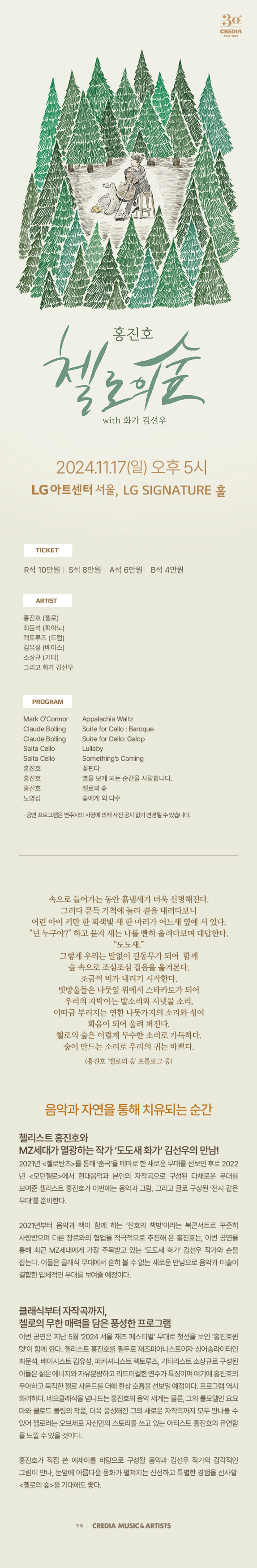 홍진호가 직접 쓴 에세이를 바탕으로 구성될 음악과 김선우 작가의 감각적인 그림이 만나, 눈앞에 아름다운 동화가 펼쳐지는 신선하고 특별한 경험을 선사할 <젤로의 숲>을 기대해도 좋다.