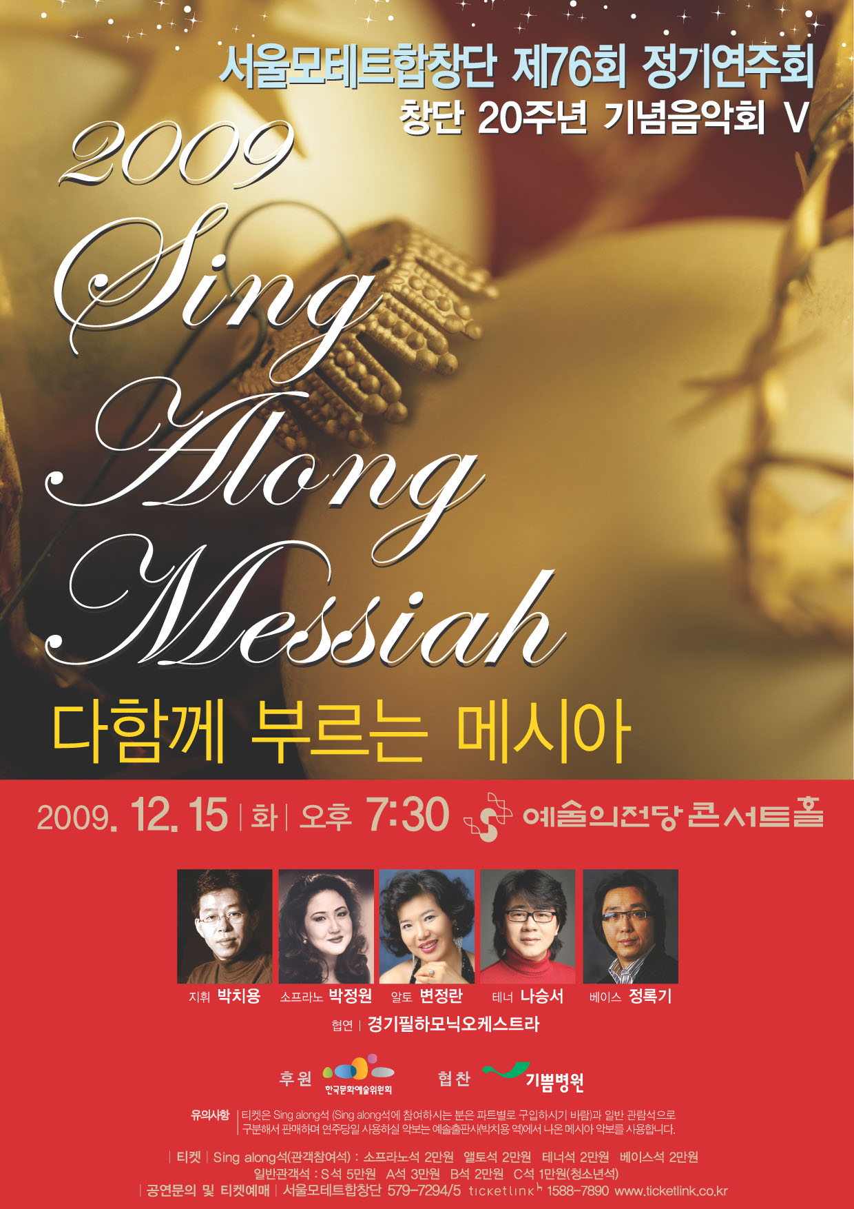 서울모테트합창단은 2009년 창단20주년기념음악회 시리즈 마지막 공연으로 12월15일(화) 오후7시30분 예술의전당 콘서트홀에서“2009 Sing along Messiah(다함께 부르는 메시아)”를 공연한다. 12월 크리스마스 시즌에 가장 많이 연주되는 헨델의 메시아를 2005년 우리나라 최초로 듣는 공연이 아니라 관객이 참여하는 공연으로 시도하여 클래식 공연문화에 새로운 장을 열었으며 해가 거듭할수록 새로운 공연문화로서의 자리매김을 확실히해가고 있다. 이 공연은 연주자와 관객이 무대와 관객석에서 악보를 보면서 같이 노래하는 진정한 의미의 열린 음악회로 관객과 연주자가 혼연일치가 되어 부르는 합창의 웅장함은 그 자리에 있는 모든 사람에게 잊지 못할 메시아로 기억될 것이다. 헨델은 24개의 오라토리오를 썼는데 합창의 중요성을 그 시대의 다른 작곡가들보다 현저하게 드러나도록 하였다. 합창이 레시타티브와 아리아를 뒷받침하기보다는 어느 사건에 대한 군중의 참여와 해설, 레시타티브 등으로 이야기를 이끌어나가도록 합창이 중요한 역할을 하게 했다. 이번 연주에는 지휘 박치용(장신대 교회음악과 겸임교수) 소프라노 박정원(한양대 음대 교수) 알토 변정란(전문연주자) 테너 나승서(서경대 음대 교수) 베이스 정록기(한양대 음대 교수) 오케스트라에는<경기필하모닉오케스트라>가 협연한다. 서울모테트합창단은 1989년 창단이후 꾸준한 연주활동으로 2005년 대한민국문화예술상 대통령상 수상, 2004올해의 예술상 음악부문 우수상을 수상하며 그 실력과 음악적 가치를 인정받았으며 ‘우리나라 합창음악을 리드하는 순수합창음악의 자존심’으로 평가 받고 있다. 특별히 대한민국문화예술상을 개인이 아닌 단체가 수상한 것은 서울모테트합창단이 처음이다. 다양하고 의욕적인 연주 활동을 통해 가장 성실하고도 음악적 내용이 충실한 합창단, 또한 현재 활동하고 있는 음악인들로부터 지명도가 가장 높은 합창단으로 국내뿐만 아니라 해외에서한국의 문화와 음악수준을 세계 속에 알리는 문화사절로서의 역할을 감당하고 있다. 그리하여 2001년 서울시로부터<전문예술법인>으로 지정받아 활동하고 있다. 이러한 연주활동과 음악적 능력은 국내외 많은 평론가들로부터의 호평은 물론 연주했던 수많은 국내외 음악가들로부터 한국을 대표할만한 최고 수준의 합창단이라는 찬사를 들어오고 있다.