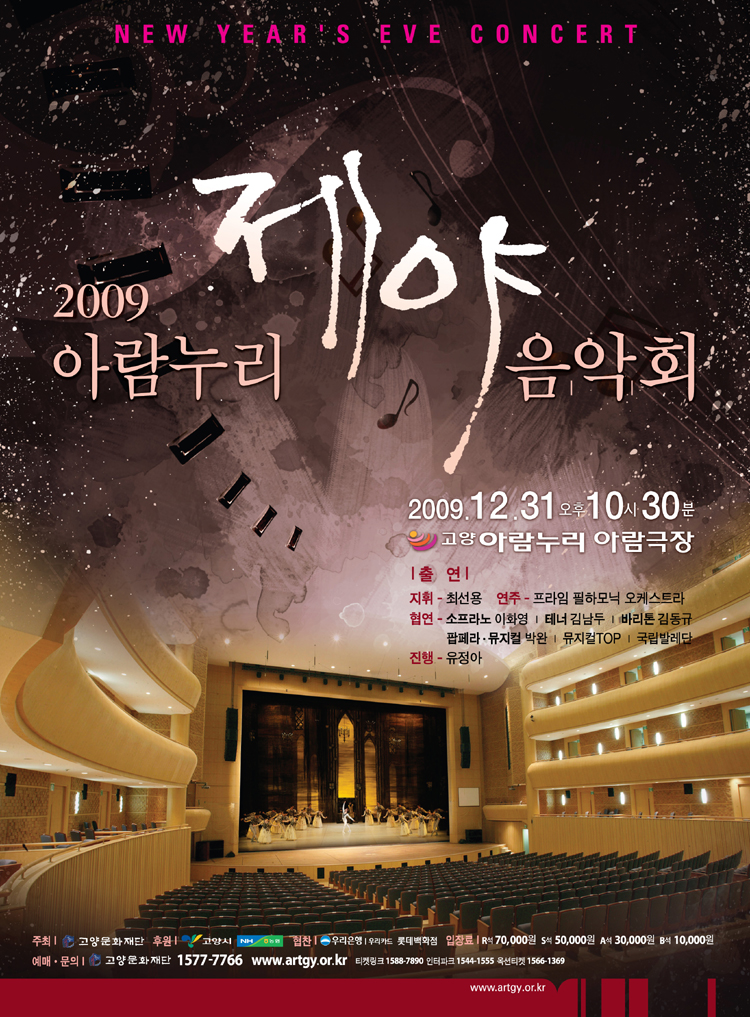 클래식부터 뮤지컬, 발레에 이르기까지 다양한 장르의 공연예술로 구성되는 “2009 아람누리 제야음악회”가 12월 31일 밤 고양아람누리 아람극장에서 열린다. 올해로 3번째를 맞이하는 고양아람누리 제야음악회는 다사다난했던 한 해를 돌아보며, 지나간 순간과 채워나갈 시간들의 소중함을 일깨워주는 특별한 공연이 될 것이다.