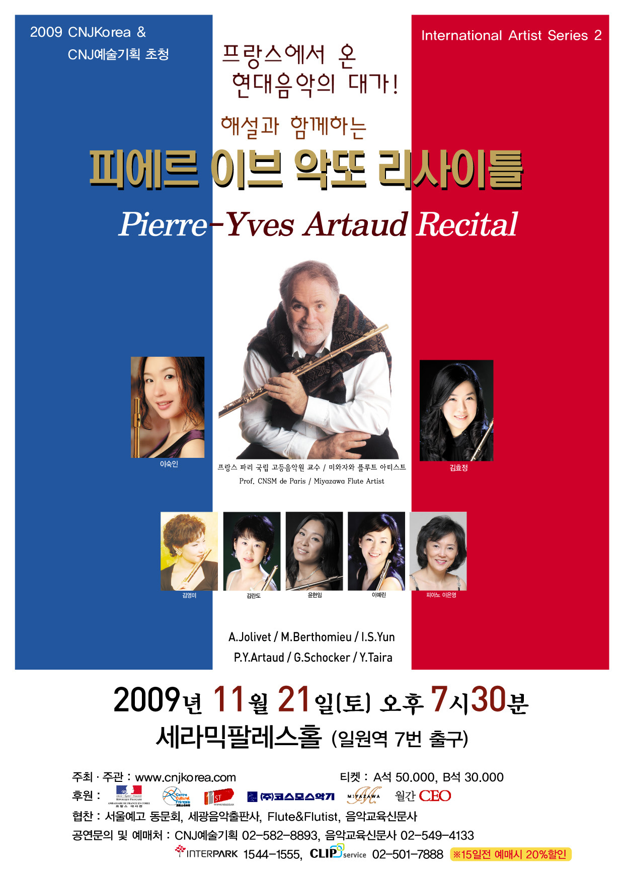 피에르 이브 악또는 현재 프랑스 최고의 교육기관인 파리 국립 고등음악원의 플루트 교수입니다. 그는 학생시절 파리 국립 고등 음악원에서 플루트와 실내악 과정을 1등으로 졸업하였습니다. 고전과 현대음악 레퍼토리의 범주를 자유롭게 넘나들면서 활발한 연주 활동을 해온 그는 세계적인 대가의 반열에 서 있는 아티스트로서 그의 커리어는 매우 다채롭습니다.