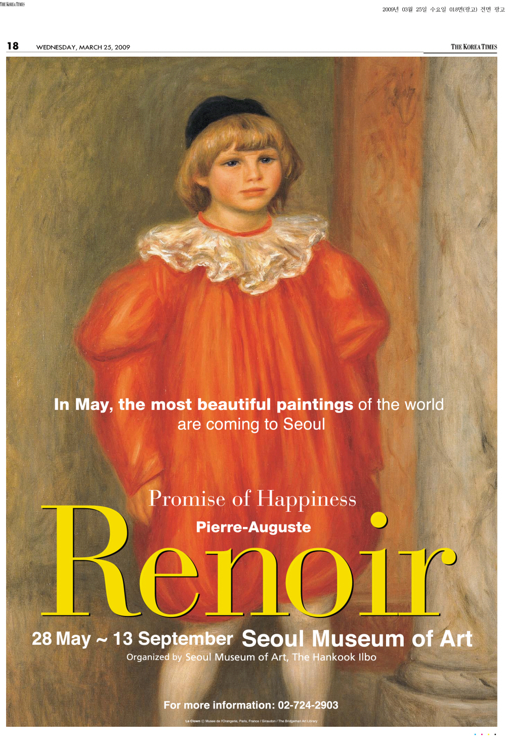 샤갈 (2004), 피카소 (2006), 모네 (2007), 반 고흐 (2007-2008) 전 등 국내 최고의 미술전시 기획으로 미술문화의 대중화에 이바지해 온 한국일보사는 전 세계인으로부터 가장 사랑 받는 관능과 환희의 인상주의 미술의 선구자 행복을 그린 화가 : 피에르 - 오귀스트 르누아르 (Pierre-Auguste Renoir, 1841-1919) 展示 를 2009 년 5 월 28 일부터 9 월 13 일까지 서울시립미술관 , SBS와 공동으로 개최한다 .