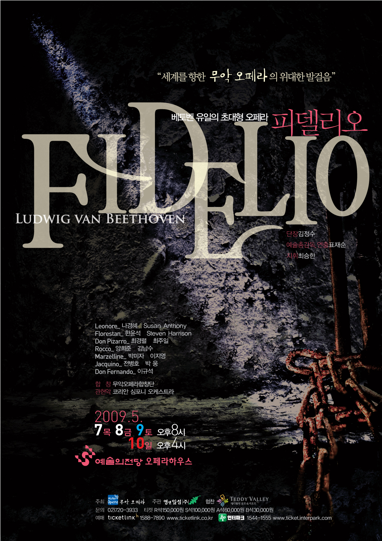세계적인 경기불황으로 바짝 움츠린 공연계의 내수시장을 단번에 강타할 초대형 블록 버스터가 한국에 곧 상륙한다. 이름하여 베토벤의 유일 무이 초대형 오페라 <피델리오>이다. 120 명의 합창단만 해도 그 웅장한 스케일을 짐작할 수 있는 <피델리오>는 오페라 장르의 최고 블록 버스터로 알려져 있으며, 그 어마한 스케일 때문에 국내는 물론 해외에서도 그리 흔하게 볼 수 있는 작품이 아니다. 베토벤은 이 작품을 10여 년에 걸쳐 세 번 고쳐 쓰고 또 네 번이나 서곡을 다시 작곡하였다. 노래극 이라기 보다 일종의 ‘종교 의식’ 같은 근엄함을 지닌 베토벤 특유의 성격을 띤 <피델리오 >는 마치 오라토리오* 에 가깝다고 할 수 있을 정도이다. 형이하학적인 관능성을 배제하고 숭고한 정신의 사랑을 추구하는 < 피델리오>는 2009년 한국관객이 선택하게 될 최고의 하이라이트로 손꼽힐 것이다 .
