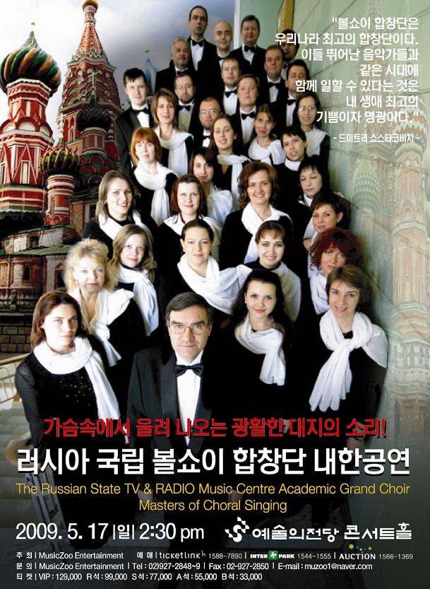 가슴속에서 우러나오는 광활한 대지의 소리, 러시아 볼쇼이 합창단의 내한무대가 열린다. 1928년에 창단된 볼쇼이 합창단은 창단 8년 만에 세계적인 합창단 대열에 들어서며 서유럽 음악계를 긴장시켰다. 1950년에는 프로코피예프의 오라토리오 세계 초연과 칸타타 파리 초연 대성공을 통해 확고한 자리매김을 하였다. 서구의 언론들은 ‘러시아 음악 전통을 가장 잘 간직하면서 현대적인 감각을 지닌 합창단’이라고 극찬했다. 쇼스타코비치는 ‘우리나라 최고의 합창단’이라고 칭찬을 아끼지 않았던 러시아를 대표하는 합창단이다. 프로코피예프를 비롯해 쇼스타코비치, 하차투리안 등 러시아 작곡가들의 많은 작품을 초연한 이 합창단은 지금도 스베틀라노프, 키타옌코, 네트렙코 등 정상급 음악가들과 다양한 무대를 가져왔다.