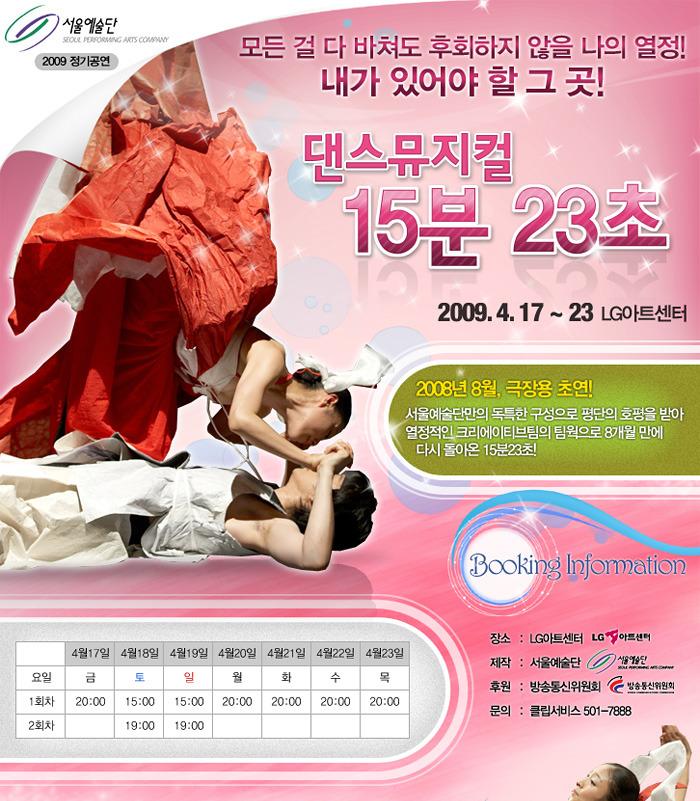 ‘15분 23초’는 2008년 8월 극장 용에서의 초연 당시 서울예술단만의 독특한 구성으로 평단의 호평을 받았었다. 당시의 크리에이티브팀이 다시 뭉쳐 열정적인 팀웍을 발휘, 더욱 세련된 ‘댄스뮤지컬’을 선보일 예정이다.