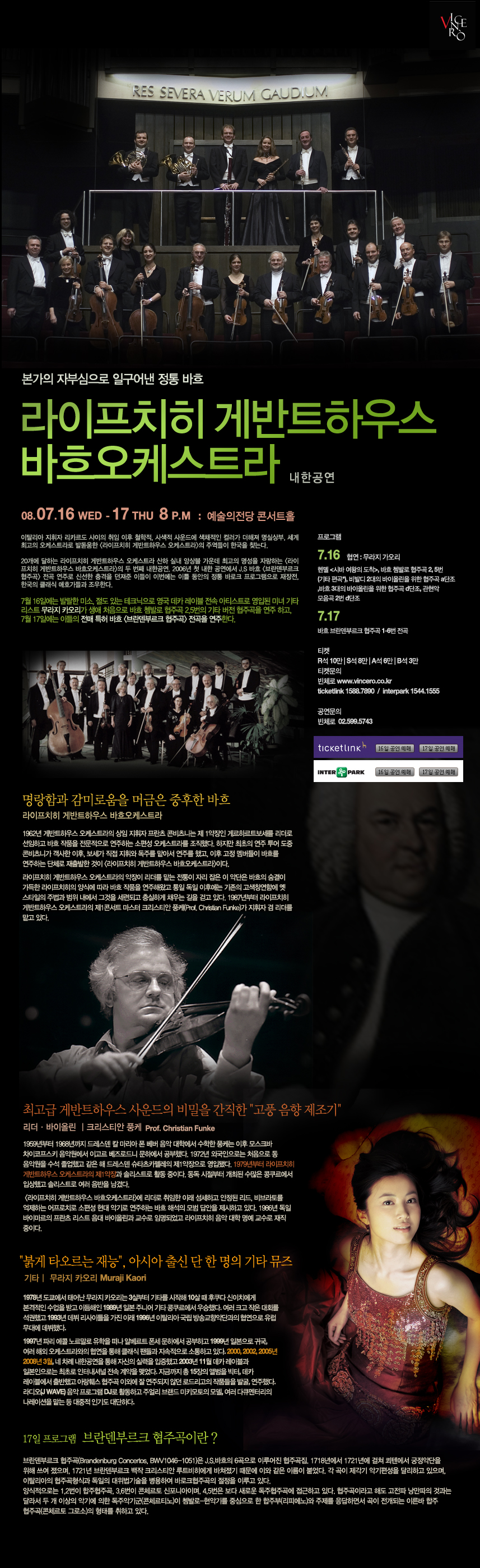 20개에 달하는 라이프치히 게반트하우스 오케스트라 산하 실내 앙상블 가운데 최고의 명성을 자랑하는 <게반트하우스 바흐오케스트라, 약칭 GBO>의 두 번째 내한공연. 2006년 첫 내한 공연에서 J.S 바흐 <브란덴부르크 협주곡> 전곡 연주로 신선한 충격을 던져준 이들이 이번에는 이틀 동안의 정통 바로크 프로그램으로 재장전, 한국의 클래식 팬들과 조우한다.