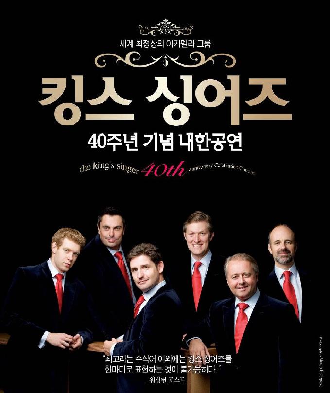 세계 최정상의 아카펠라 그룹 킹즈 싱어즈 40주년 기념 내한공연 일시 2008.6.24(화) 저녁 8시 장소 세종문화회관 대극장 -영국이 자랑하는 세계 최정상의 아카펠라 그룹 수정처럼 투명한 사운드, 정제된 음색으로 남성이 표현할 수 있는 가장 아름다운 하모니를 선보이는 남성 아카펠라 중창단 킹스 싱어즈가 역사적인 결성 40주년을 기념한 세계 투어의 일환으로 오는 6월 24일 세종문화회관 대극장을 찾는다. 비틀즈와 함께 전세계에 영국을 대표하는 아티스트로 손꼽히는 킹스 싱어즈는 캠브리지 대학 킹스 컬리지 출신의 6인조 남성 아카펠라 중창단으로 시작, 교회 합창곡에서 무반주 양식을 일컬었던 “아카펠라”를 새로운 장르로 발전시키고 대중화시킨 선구자적 아티스트로 평가 받고 있다. 비틀즈의 프로듀서였던 조지 마틴(George Martin)이 “한 치의 오차도 없는 정확한 박자와 환상적인 음조가 이룬 프로정신의 극치”라고 표현한 완벽한 하모니와 위트 있는 무대매너는 지금까지도 이들이 최고라고 평가 받을 수 있었던 이유일 것이다. 특히 클래식을 근간으로 팝, 포크, 재즈, 민속음악을 비롯해 죄르지 리게티(Gyorgy Ligeti), 크시슈토프 펜데레츠키(Krystof Penderecki), 루치아노 베리오(Luciano Berio), 피터 맥스웰 데이비스(Peter Maxwell Davies) 등 이 시대를 대표하는 유명한 현대 작곡가들이 헌정한 음악까지 전 장르를 아우르는 레퍼토리는 이들의 공연을 더욱 풍성하게 만드는 자양분이다. 현재까지 발매된 음반만100개에 이르는 킹스 싱어즈의 방대한 작품 라이브러리는 같은 공연장에서 다시 공연할 경우 같은 프로그램으로 공연하지 않는다는 이들의 의지를 뒷받침 해줄 수 있는 소중한 재산이 되며 알래스카에서부터 중국, 케이프타운에서 코펜하겐까지 년간 100회 이상의 공연을 통해 이를 증명하고 있다. 또한 런던 심포니, 시카고 심포니 등 유명 오케스트라는 물론 키리 테 카나와, 바버라 헨드릭스, 이매뉴얼 액스, 이블린 글레니, 조지 셰어링을 비롯해 ‘비치 보이스’의 브루스 존스턴 등 최고의 솔로이스트들과의 협연을 통해 조화와 균형에 대한 이들의 끊임없는 노력을 보여주고 있다. 그러나 무엇보다도 킹스 싱어즈를 기다리게 되는 이유는 그들의 음악이 주는 순수한 즐거움일 것이다. -40주년을 기념하는 엄선된 레퍼토리 이번 공연 프로그램은 40주년을 기념하여 특별히 그들의 대표곡인