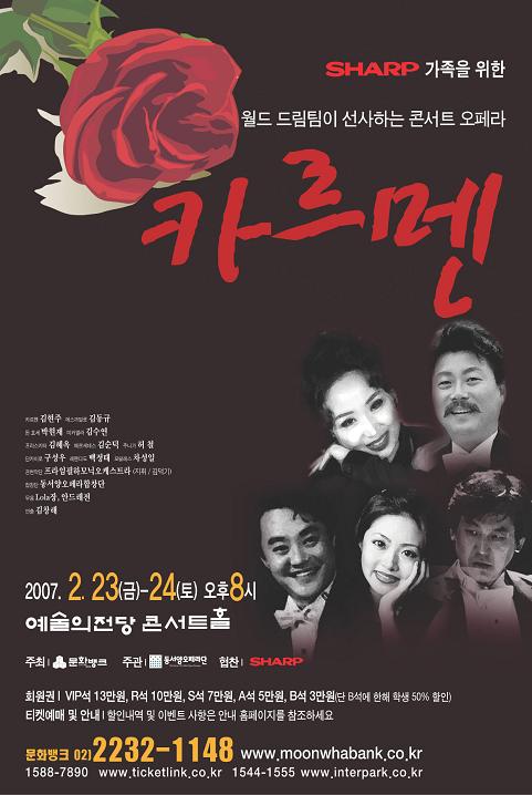 더 이상의 말이 필요 없는 한국이 낳은 월드스타들이 총 출연하여 최절정의 2007오페라 드림팀을 구성, 세계인들의 사랑을 가장 많이 받고 있는 비제의 걸작 오페라“카르멘”을 준비 클래식 매니아 및 오페라를 사랑하는 모든 분들을 초청 환상적인 꿈의 오페라 무대를 선사합니다.