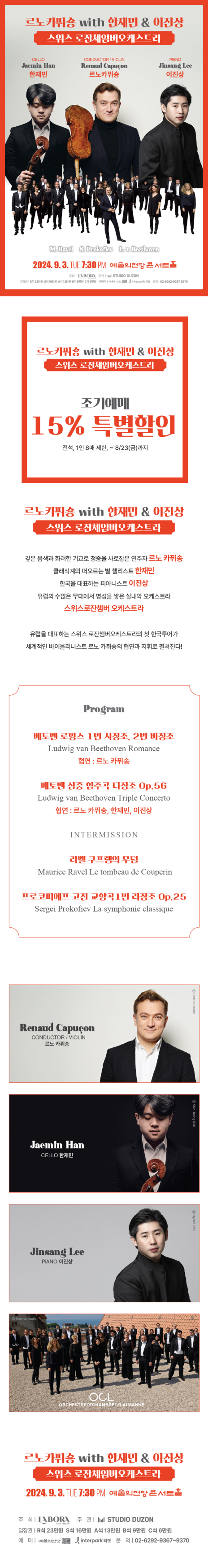 유럽을 대표하는 챔버오케스트라 중의 하나인 ‘스위스 로잔챔버오케스트라’의 첫 내한공연이 프랑스를 대표하는 바이올리니스트 르노 카퓌송의 지휘로 열린다. 이번 공연에서는 첼리스트 한재민과 피아니스트 이진상의 협연, 그리고 바이올리니스트 카퓌송의 지휘 및 협연으로 특별함을 더한다. 프로그램은 베토벤 ‘로망스 1번과 2번’, 베토벤 ‘삼중 협주곡’, 라벨 ‘쿠프랭의 무덤’, 프로코피예프 ‘고전 교향곡 1번’이 연주된다.