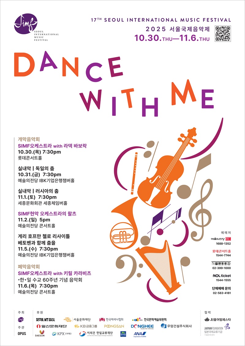 2025 서울국제음악제는 10월 30일(목)부터 11월 6일(목)까지 일주일간 총 6회의 무대를 선보인다. 올해의 주제는 ‘Dance with Me’이며, 왈츠, 탱고, 발레 등 서양 음악사를 이끌어온 ‘춤’이라는 요소를 매개로 클래식 음악이 전하는 삶의 활력과 기쁨을 관객과 나눈다.