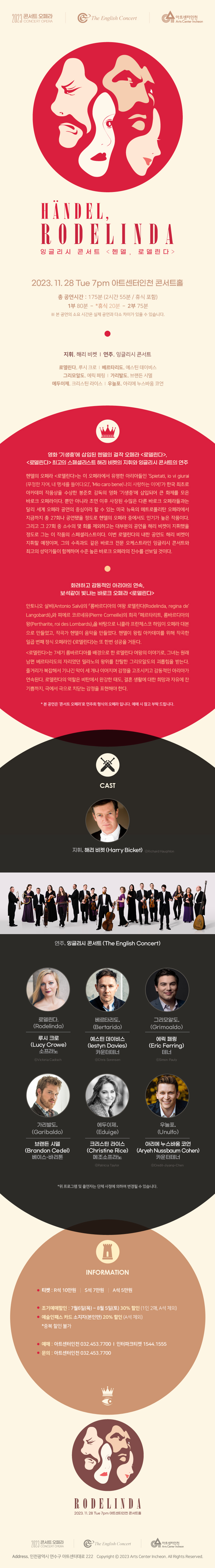 헨델의 오페라 <로델린다>는 이 오페라에서 유명한 아리아들인 ‘Spietati, io vi giurai (무정한 자여, 내 맹세를 들어다오)’, ‘Mio caro bene(나의 사랑하는 이여)’ 가 한국 최초로 아카데미 작품상을 수상한 봉준호 감독의 영화 ‘기생충’에 삽입되어 큰 화제를 모은 바로크 오페라이다. 뿐만 아니라 초연 이후 사장된 수많은 다른 바로크 오페라들과는 달리 세계 오페라 공연의 중심이라 할 수 있는 미국 뉴욕의 메트로폴리탄 오페라에서 지금까지 총 27회나 공연됐을 정도로 헨델의 오페라 중에서도 인기가 높은 작품이다. 그리고 그 27회 중 소수의 몇 회를 제외하고는 대부분의 공연을 해리 비켓이 지휘했을 정도로 그는 이 작품의 스페셜리스트이다. 이번 로델린다의 내한 공연도 해리 비켓이 지휘할 예정이며, 그의 수족과도 같은 바로크 전문 오케스트라인 잉글리시 콘서트와 최고의 성악가들이 함께하여 수준 높은 바로크 오페라의 진수를 선보일 것이다.