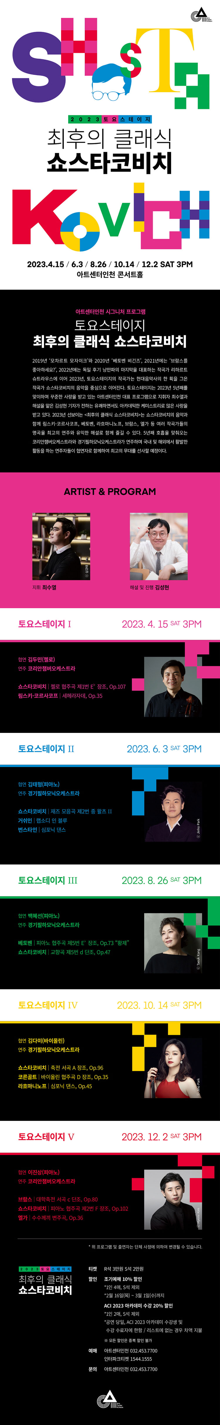 2019년 ‘모차르트 모자이크’와 2020년 ‘베토벤 비긴즈’, 2021년에는 ‘브람스를 좋아하세요?’, 2022년에는 독일 후기 낭만파의 마지막을 대표하는 작곡가 ‘리하르트 슈트라우스’에 이어 2023년, 토요스테이지의 작곡가는 현대음악사의 한 획을 그은 작곡가 쇼스타코비치의 음악을 중심으로 이어집니다.