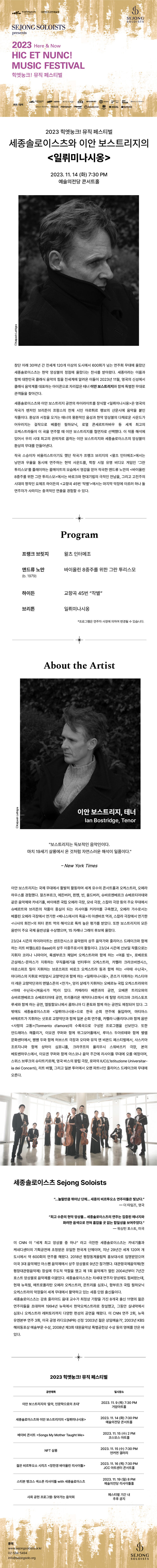 전반부는 작곡가 브리튼의 어린 시절 스승으로 잘 알려진 영국의 작곡가 프랭크 브리지(1879-1941), 줄리아드 스쿨 교수인 작곡가 앤드류 노만(1979-)의 작품에 이어 하이든(1732-1809)의 교향곡 45번 ‘작별’을 연주한다. 후반에 연주되는 <일뤼미나시옹 (Les Illuminations)>은 프랑스의 천재 시인인 랭보의 동명 시집에서 발췌한 9개의 산문시에 브리튼이 곡을 붙인 작품이다. 가곡 역사상 시인과의 음악가의 매혹적 만남을 꼽으면 늘 거론되는 작품이며 ‘하이 보이스(High voice, 높은 음역 성악)’와 현악을 위한 편성으로 작곡되었기 때문에 테너 뿐 아니라 소프라노의 무대도 자주 볼 수 있다. 보스트리지는 2005년 베를린 필하모닉 오케스트라의 멤버들과 사이먼 래틀의 지휘로 동명의 앨범을 발표한 적이 있다. “작품 해석의 완전함으로 인해 일련의 노래라기보다는 미니 오페라처럼 보이게 만든다.”라는 평가를 받았다. 이 음악회는 원래는 2020년 기획되었다가 코로나로 미뤄져 3년이 지나 무대에 올라간다. 2023년 한영 수교 140주년을 맞아 더욱 뜻깊은 음악회가 되었다.