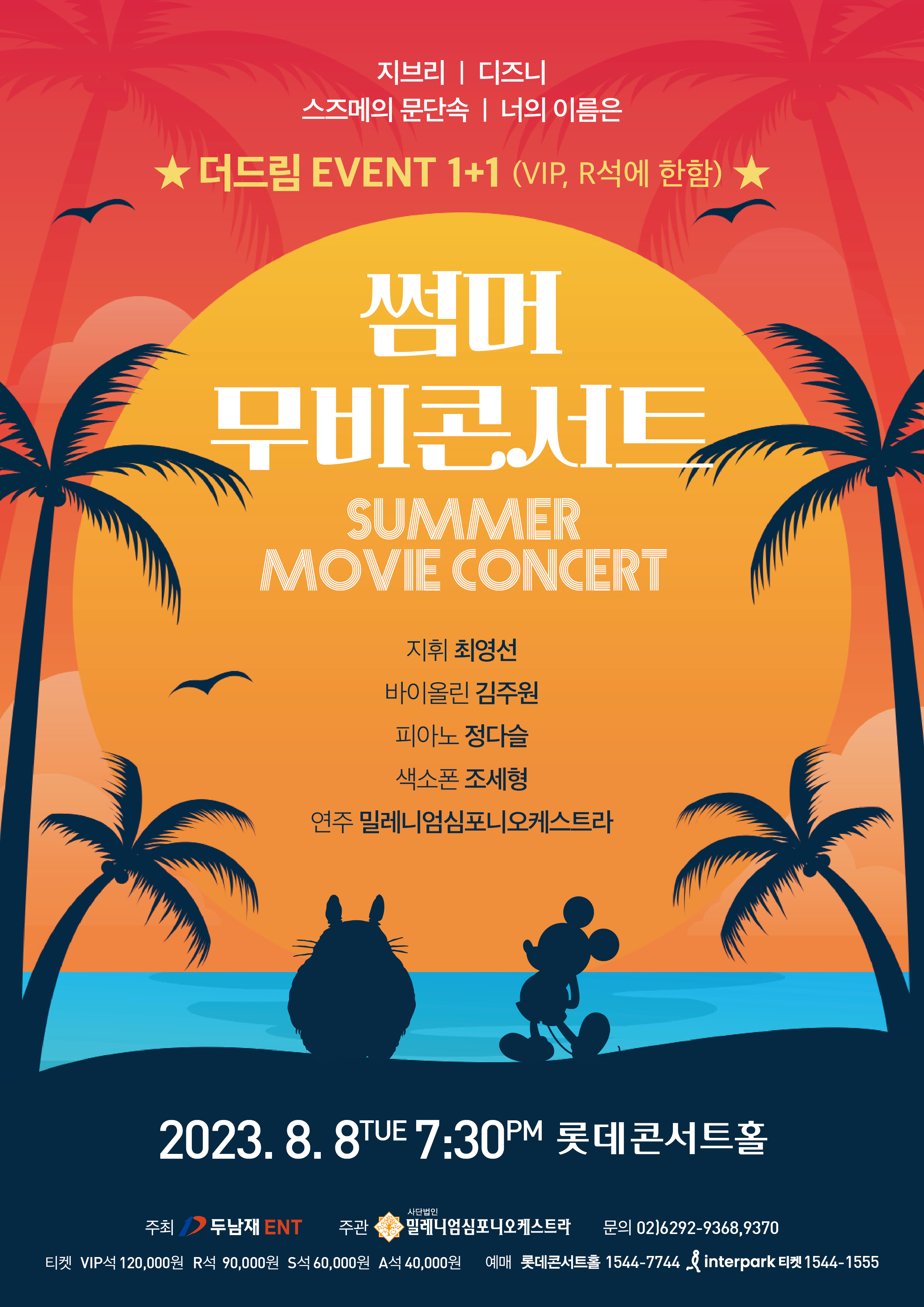 <썸머 무비 콘서트>는 ‘두남재ENT’ 주최, ‘밀레니엄심포니오케스트라’의 주관으로, 지휘자 최영선, 바이올리니스트 김주원, 색소포니스트 조세형, 피아니스트 정다슬, 연주 밀레니엄심포니오세트라와 함께 인기 애니메이션 OST 모음곡을 오는 8월 8일 저녁 7시 30분, 롯데콘서트홀에서 진행하는 공연이다.