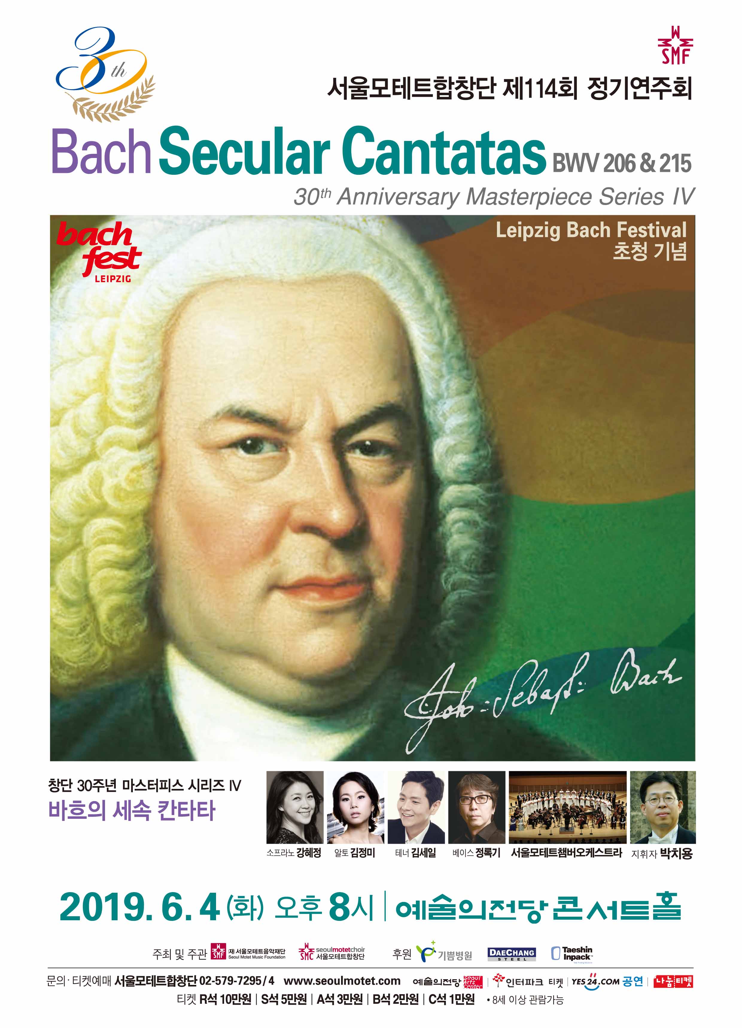 ★월요일부터 금요일까지 생방송 중에 50원의 정보이용료가 부과되는 # 9390 문자로 <공연 제목>과 <본인 성함>을 정확히 적으셔서 신청해주세요. 당첨자 분들에게는 개별적으로 당첨안내문자를 보내드립니다.★ 1. 일시 : 2019년 6월 4일 (화) 저녁 8시 2. 장소 : 예술의전당 콘서트홀 3. 초대인원 : 5쌍 (1인 2매, 총 10매) 4. 작품설명 : 서울모테트합창단 창단 30주년 기념 마스터피스 시리즈 IV J. S. Bach Secular Cantatas BWV 206 & 215 서울모테트합창단 제114회 정기연주회 ***출연자 지휘 박치용(서울모테트합창단 상임지휘자) 협연 서울모테트챔버오케스트라 솔리스트 Soprano 강혜정, Alto 김정미, Tenor 김세일, Bass 정록기 “맑고 깨끗한 울림, 정제된 화음, 깊이 있는 음악으로 순수합창의 진수를 선보이는 최고 수준의 합창단” 국내 유일의 민간프로페셔널 합창단으로 30년간 올곧게 순수 합창음악의 외길을 걸어오며 한국음악계 발전을 위해 노력하고 기쁨의 음악을 넘어선 감동의 음악을 선사해 온 서울모테트합창단이 창단 30주년 기념 마스터피스 시리즈 네 번째 작품으로 2019년 6월 4일 (화) 오후 8시 예술의전당 콘서트홀에서 Johann Sebastian Bach의 「Secular Cantatas BWV 206 & BWV 215」를 연주한다. “궁정음악의 화려함과 기품을 보여주는 걸작” 바흐의 세속 칸타타(Secular Cantata)는 영주 또는 그 가족의 생일, 결혼, 장례, 추도 등 특별한 날을 기념하기 위해 주로 쾨텐 시절과 라이프치히 시절에 작곡 되었으며, 교회 칸타타와 달리 코랄(루터교회의 찬송가)이 사용되지 않았다는 특징을 가지고 있다. 이번에 연주되는 BWV 206 & BWV 215 두 칸타타는 모두 1736년 ‘궁정작곡가’ 칭호를 주었던 드레스덴의 작센 선제후이자 폴란드 왕 아우구스트 3세를 위해 작곡되어 서로 밀접한 관련이 있다. Secular Cantata BWV 206번 ‘Schleicht, spielende Wellen, und murmelt gelinde!’(살랑이는 파도여 다가오라, 그리고 부드럽게 속삭여라)는 1736년 아우구스트 3세의 생일을 맞이하여 작곡된 곡으로 작센 주위에 흐르는 4개의 강인 플라이쎄 강(소프라노), 도나우 강(알토), 엘베 강(테너), 바이크셀 강(베이스)을 의인화하였고, 오케스트라를 통해 물의 이미지가 연상되게 작곡했다는 특징이 있으며 1736년 10월에 초연되었다. Secular Cantata BWV 215번 ‘Preise dein Glucke, gesegntes Sachsen’(복되어라 작센이여, 너의 행운을 찬양하라)은 1734년 아우구스트 3세의 선제후 계승 1주년을 축하하기 위해 작곡된 곡으로 더블 콰이어를 사용해 웅장함과 화려함이 돋보이며 후에 「b단조 미사」와 「크리스마스 오라토리오」의 일부로 사용되기도 했다. 바흐는 세속 칸타타를 통해 교회와 세상을 구분하여 보지 않았다. 오히려 모든 영역이 하나님의 주권 아래 있으며, 선교의 대상임을 인정함과 동시에 음악이 가지는 독립성을 확실히 하여 세속 칸타타가 미사곡, 오라토리오, 수난곡 등에 개작 되는 등, 바흐의 폭넓고 위대한 음악 유산으로 지금까지 연주되고 있다. 특별히 이번에 연주하는 두곡 「BWV 206, BWV 215」은 서울모테트합창단이 2019 라이프치히 바흐페스티벌에 한국합창단 최초로 공식 초청되어 연주하게 된다. 서울모테트합창단은 창단 이후 바흐 음악에 대한 지속적인 연구와 왕성한 연주로 우리 사회와 음악계에 바흐 음악을 알리고 보급하는데 끊임없이 노력해왔다. 이번 114회 정기연주회에서는 바흐 세속칸타타가 가진 풍부하고 조화로운 선율미와 각 파트간의 분명한 역할, 그리고 깊이 있고 영감 가득한 합창음악의 극치를 선사할 예정이다. 지휘 박치용(서울모테트합창단 상임지휘자), 소프라노 강혜정, 알토 김정미, 테너 김세일, 베이스 정록기가 협연한다. 2019년 창단 30주년을 맞이하는 서울모테트합창단은 ‘순수하고 이상적인 합창음악의 실현’과 ‘교회음악의 바른 이상을 제시하고 실천’하겠다는 뚜렷한 목표를 가지고 활동해 온 대한민국을 대표하는 국내 유일의 민간 프로합창단이다. 서울모테트합창단은 지난 30년간의 다양한 연주 활동을 통해 우리 사회와 음악문화 전반에 좋은 영향을 끼쳐 왔고 그 공로가 인정되어 2005년 ‘대한민국문화예술상′(음악부문 대통령상)수상, 2011년 ′대원음악상′(대원문화재단)수상, 2014년 ‘공연예술상’(공연예술경영인협회), 2016년 제17회 메세나대상 ‘Arts&Business상’수상, 2017년 제3회 예술의전당 예술대상 ‘최우수상’ 등을 수상하였다. 이처럼 연주 단체로서 실력과 음악적 가치를 크게 인정받으며 정도를 걸어 온 서울모테트합창단은 지난 2014년 그간의 노력과 경험을 바탕으로 (재)서울모테트음악재단을 설립 하였고 연주단체로뿐만 아니라 음악재단으로서 지경을 넓혀가고 있으며 30년째 걸어왔던 길을 계속 갈 것이다. ***지휘자 박치용 『가장 순수한 목소리의 울림, 자연스러운 리듬의 표출, 깊이 있는 음악의 해석으로 합창음악에 대한 새로운 깊이와 즐거움을 맛보게 해 준 지휘자』 『“섬세하고 치밀한 완벽주의자” “생명의 소리를 전하는 구도자”』라는 평을 받아오고 있다. 지휘자 박치용은 1989년 <서울모테트합창단>을 창단하였고 무리 없는 자연스러운 발성과 풍부한 배음으로 표현되는 하모니를 통하여 영감 가