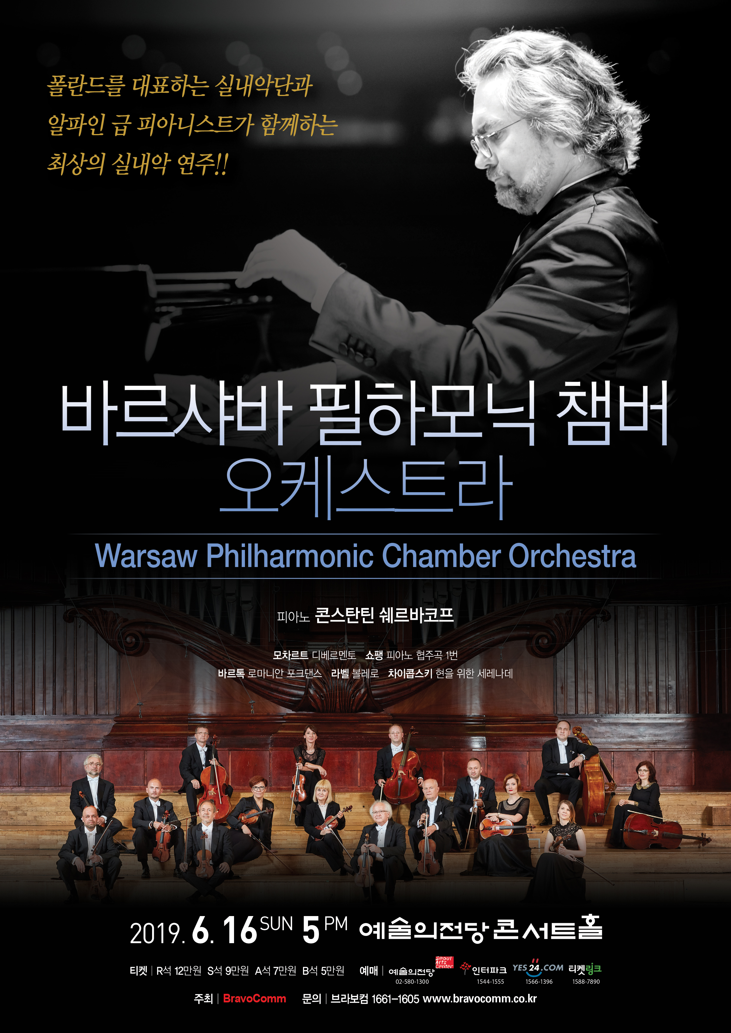 ★월요일부터 금요일까지 생방송 중에 50원의 정보이용료가 부과되는 # 9390 문자로 <공연 제목>과 <본인 성함>을 정확히 적으셔서 신청해주세요. 당첨자 분들에게는 개별적으로 당첨안내문자를 보내드립니다.★ 1. 일시 : 2019년 6월 16일 (일) 오후 5시 2. 장소 : 예술의전당 콘서트홀 3. 초대인원 : 5쌍 (1인 2매, 총 10매) 4. 작품설명 : 폴란드를 대표하는 실내악단 바르샤바 필하모닉 챔버 오케스트라 첫 내한공연 폴란드를 대표하는 실내악단과 알파인 급 피아니스트가 함께하는 최상의 실내악 연주!! 쇼팽의 고장 폴란드를 대표하는 실내악단 바르샤바 필하모닉 챔버 오케스트라가 첫 내한공연을 한다. 섬세하고 풍부한 음색으로 세계인의 사랑을 받고 있는 오케스트라는 바르샤바 필하모닉 오케스트라의 멤버들로 구성되었으며, 바르샤바 필하모닉 소속 연주자들이 수행해 왔던 실내악의 오랜 전통을 이어가고 있다. 제2차 세계대전 때 많은 연주자들의 희생으로 주춤했던 이들의 활동은 바르샤바 필하모닉 100주년 기념행사에서 안토니 비트의 후원으로 다시 활성화 되었으며, 2002년 2월 10일 공식 명칭으로 첫 콘서트를 가진 이후 2013년 쇼팽 어워즈와 그래미 어워즈를 수상하는 등 그들의 기량을 입증하고 있다. 2019년 6월16일 일요일 서울 예술의전당을 시작으로 대구, 인천, 울산, 계룡 등 5곳에서 첫 내한공연을 하며, 현재 한국인들의 가장 사랑을 받고 있는 「쇼팽 피아노 협주곡 1번」을 쇼팽 피아노 콩쿨 우승자(율리아나 아브제예바)를 길러낸 콘스탄틴 쉐르바코프의 연주로 최상의 실내악 연주를 감상할 수 있다. ***바르샤바 필하모닉 챔버 오케스트라 우아하고 따뜻한 그리고 중후한 미뉴에트를 만들어내는 바르샤바 필하모닉 챔버 바르샤바 필하모닉 소속 연주자들이 수행한 실내악의 오랜 전통을 이어가고 있는 바르샤바 필하모닉 챔버 오케스트라의 첫 번째 실내악 앙상블은 20세기 초 필하모닉에서 설립되었다. 1960년대와 70년대에 카롤 토이치(Karol Teutsch)가 이끈 바르샤바 필하모닉 챔버 뮤지션 앙상블은 세계 콘서트 무대에서 수많은 성공을 거두었고, 바르샤바 필하모닉의 음악인들로 구성된 다른 앙상블도 국제적인 인정을 받았다. 1990년대에는 바르샤바 필하모닉 스트링 오케스트라가 유명한 솔리스트(Konstanty A. Kulka, Nigel Kennedy)들과 콘서트를 개최하며 음반 발매와 더블어 TV 프로그램으로 제작 방영되는 등 다방면으로 활동을 해왔다. 제2차 세계대전 때 많은 연주자들의 희생으로 주춤했던 이들의 활동은 바르샤바 필하모닉 100주년 기념행사에서 안토니 비트의 후원으로 다시 활성화 되었으며, 2002년 2월 10일 공식 명칭으로 첫 콘서트를 가졌다. 이때 얀 레브탁이 챔버 오케스트라의 예술 감독으로 취임했다.. 2009년 2월 오케스트라는 그라치나 바체비치(Gra?yna Bacewicz) 탄생 100주년을 기념하며 최근 발견된 두 곡(1929년 신포니에타와 1946년 심포니)의 초연을 포함하여 이 탁월한 작곡가의 작품들로 모두 구성된 프로그램을 발표했고 소니 뮤직에서 앨범이 발매되었다. 2011년에는 오케스트라 10주년 기념 콘서트가 음반으로 발매되었고 노미네이트 판매기록과 쇼팽 어워즈(2013)를 수상했다. 그리고 2013년 2월 크리슈토프 펜데레츠키가 작곡한 “Fonogrammi”를 안토니 비트 지휘로 낙소스에서 녹음하여 그래미 어워즈 수상하는 등 섬세하고 풍부한 음색으로 세계인의 사랑을 받고 있다. ***Piano 콘스탄틴 쉐르바코프 Konstantin Scherbakov “Alpine level of pianism.” - American Record Guide “A major pianist of our time.” Fanfare Magazine 러시안 피아니스트로 11세 때 베토벤 피아노 협주곡 1번으로 데뷔, 차이콥스키 음악원에서 레프 나우모프를 사사했다. 제1회 라흐마니노프 피아노 콩쿨 우승에 이어 몬트리올, 몰자노, 로마 그리고 취리히 등에서 개최된 권위 있는 콩쿨을 휩쓸며 명성을 떨쳤다. 루체른 페스티벌에서 “Rachmaninoff of Today."라는 호평과 함께 콘스탄틴의 라흐마니노프 피아노 리사이틀을 4번 관람한 스비아토 슬라브 리히터는 극찬을 했다. 특히 콘스탄틴의 빼어난 명반들 중 리스트가 피아노곡으로 편곡한 ‘베토벤 교향곡 제9번’ 음반은 독일 비평가상, ‘고도프스키의 소나타 E단조’ 음반도 독일 비평가상(2001), 24개의 프렐류드와 쇼스타코비치의 작품들로 녹음된 낙소스 음반은 칸에서 클래식 부문을 수상(2001)하는 등 다양한 음반들을 제작했다. 많은 콘서트와 녹음 일정 속에서 콘스탄틴 쉐르바코프는 1998년 취리히 예술 대학교에서 후학을 양성하고 있으며, 또한 정기적으로 마스터 클래스 개최와 권위 있는 피아노 콩쿨 심사위원으로 위촉되어 활동하고 있다. #프로그램 모차르트, 디베르티멘토 D장조, K.136 쇼팽, 피아노 협주곡 제1번 E단조 Op.11