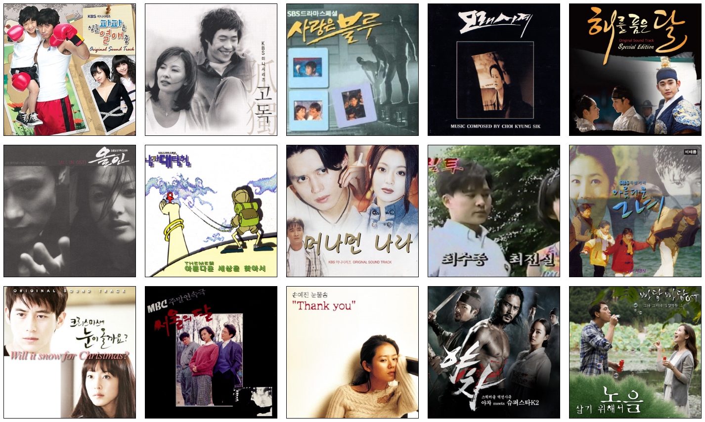 1. 김동희 <썸데이> - 2008년 드라마 <싱글파파는 연애중> 삽입곡 - 오지호, 강성연, 허이재 등 출연 - 이 곡을 2016년 드라마 <판타스틱>에서 가수 팀이 리메이크해서 부르기도 했음. 2. 정선연 <빈 처(處)> - 2002년 드라마 <고독> OST 수록곡 - 이미숙, 류승범, 홍요섭, 서원 등 출연 - 같은 OST에 정선연의 <고독>이나 <고백>, 서진영의 <나는 아닌거니> 같은 곡들도 있음. 3. 홍종명 <사랑은 블루> - 1995년 드라마 <사랑은 블루> 주제곡 - 이정재, 박상민, 이종원 전도연 등 출연 4. 드미트리 흐보로스톱스키 <백학> - 1995년 드라마 <모래시계> 삽입곡 (정식 OST에는 포함되어 있지 않음) - 최민수, 고현정, 박상원, 이정재, 이승연 등 다수 출연 - 가요는 아니지만, 개인적으로 너무 좋아했던 곡이어서 함 올려봅니다. - 드라마 OST에는 혜린의 테마를 비롯해서 다양한 곡들이 있음. 5. 린 <시간을 거슬러> - 2012년 드라마 <해를 품은 달> OST 수록곡 - 김수현, 한가인, 정일우, 김민서, 송재희 등 출연 - OST에는 해오라의 <달빛이 지고>를 비롯해서 이기찬의 <아니기를> 등의 곡들도 있음. 6. 박용하 <처음 그날처럼> - 2003년 드라마 <올인> OST 수록곡 - 이병헌, 송혜고, 지성, 박솔미 등 출연 7. 테마 <비워낼 수 없는 슬픔 Ⅱ (Rock Ballade ver.)> - 1996년 드라마 <남자대탐험> OST 수록곡 - 변우민, 김남주, 임상아, 최준용 등 출연 - OST에는 테마의 <아름다운 세상을 찾아서>를 비롯해서 <비워낼 수 없는 슬픔>의 R&B 버전도 있음. 8. 김민종