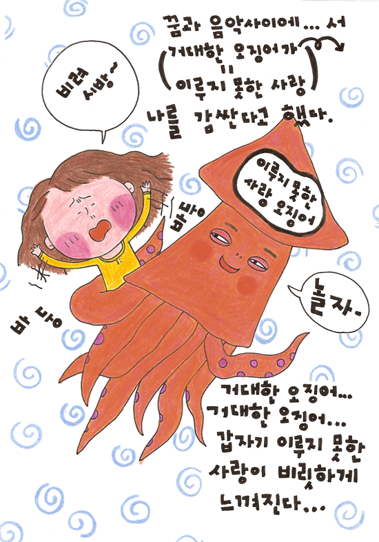 거대한 오징어와 오징어에 얽매여 있는 자신을 상상해봤어요!!!
