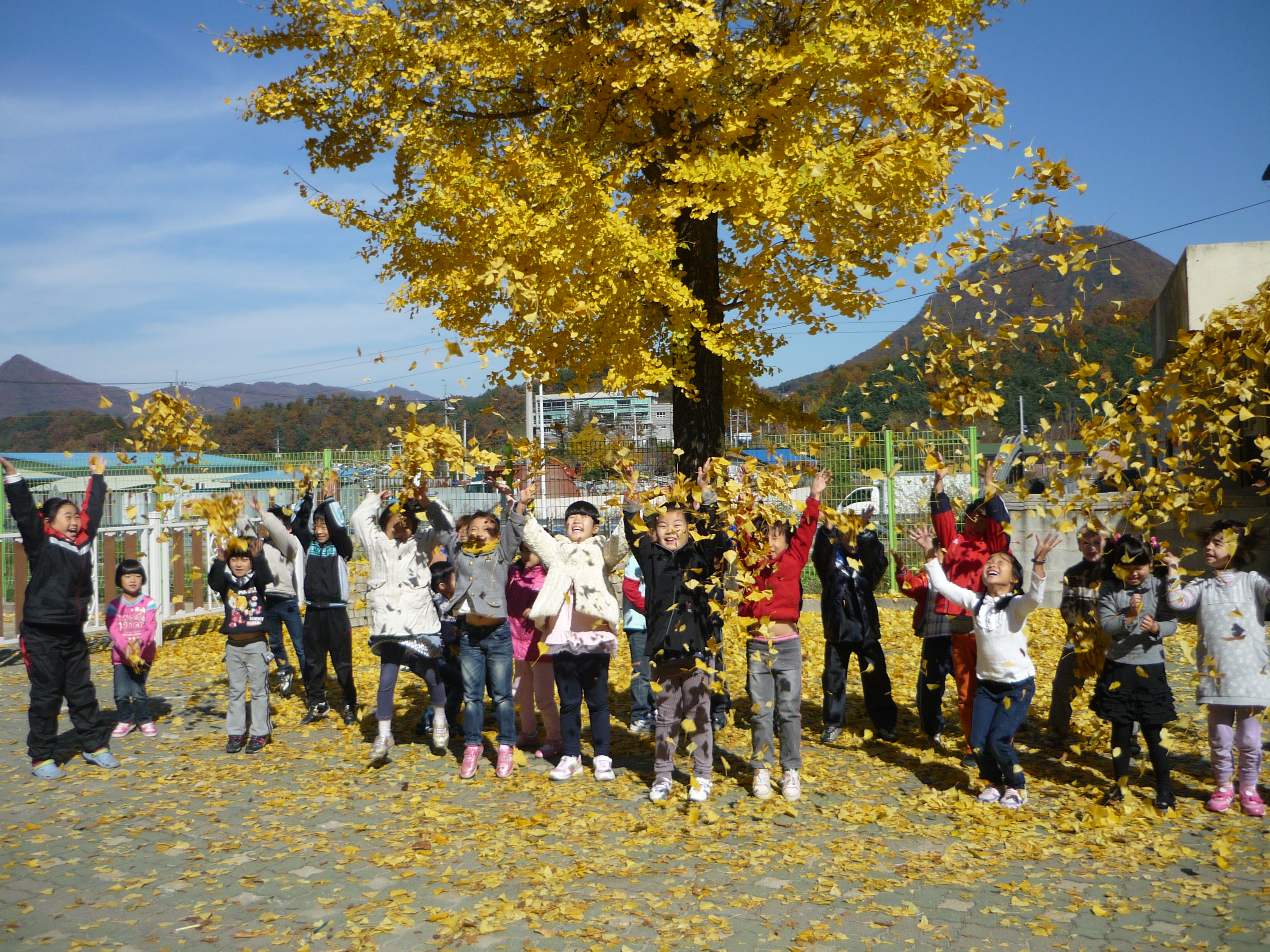 배꼽까지 보여가며 은행잎을 던지는 모습이 정말 귀엽죠^^