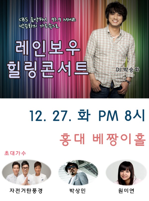 가요속으로에서 한해 동안 그 누구보다 고생하고 애쓰신.. 그래서 힘이 필요하신 여러분들을 위한 자리를 마련했습니다. <박승화의 가요속으로 레인보우 힐링 콘서트> 일시 : 12월 27일 화요일, 오후 8시 장소 : 홍대 베짱이 홀 초대가수 : 박상민, 원미연, 자전거 탄 풍경 참여방법 : 아래 신청 게시판에 가고 싶은 이유를 적어 신청해주세요~ ------------------------------------------------------------ ☞[콘서트 참여] ..<- 여기 클릭해서 신청하시면 돼요 ------------------------------------------------------------ 성함, 신청인원. 연락처 그리고 내가 이 공연에 꼭 와야하는 이유를 적어주시면 됩니다 당첨자는 따로 연락 드립니다 공연장을 찾아주신 모든 분들에게 피부과학의 리더, 리더스 코스메틱에서 앰플 마스크팩을 드립니다. ※이 공연은 서울시 시민건강국과 함께 합니다※