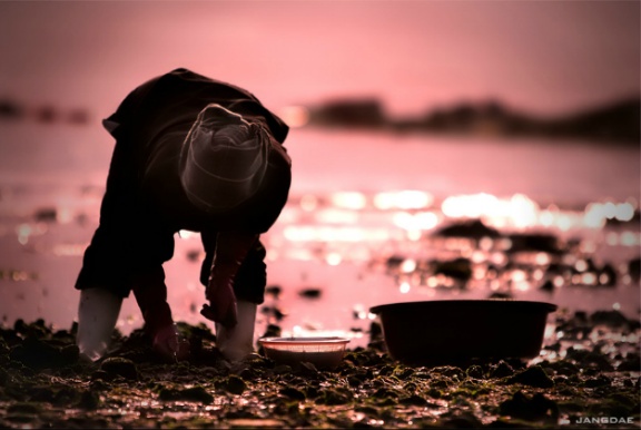 물을 데우기 위해 허리를 굽혀 물을 기르시고..