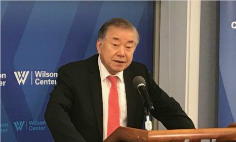 문정인 특보가 지난해 9월 미국 워싱턴DC의 우드로윌슨센터에서 오찬 기조연설을 하고 있다. 사진=노컷뉴스