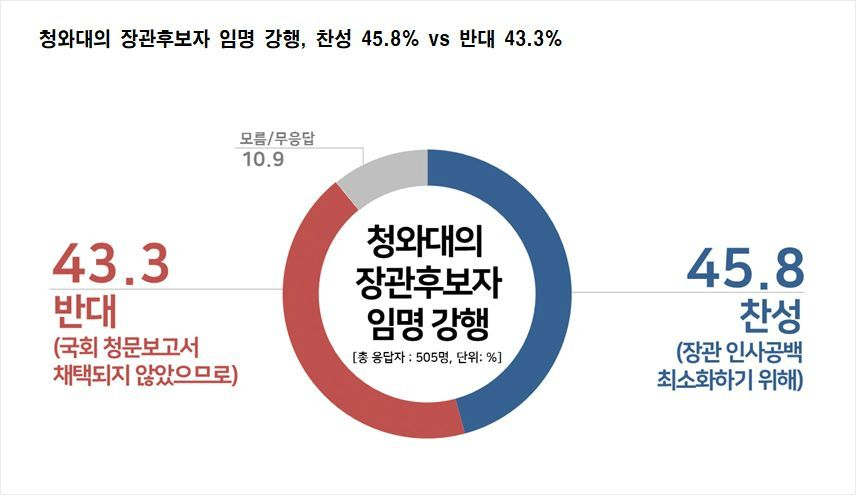 ◆ 이택수> 저희가 지난 5일 금요일 전국 19대 이상 성인 9369명에게 접촉을 해서 최종 505명이 응답을 완료했습니다. 6.3%의 응답률, 무선 전화 면접 및 유무선 자동 응답 혼용 방식이었고요. 표본오차는 95% 신뢰 수준에서 ±4.4%포인트였습니다. 질문은 다음과 같았는데요. 최근 장관 후보자 7명 중 2명이 지명 철회되거나 자진 사퇴했고 국회는 일부 장관 후보자에 대한 청문 보고서를 채택하지 않고 있습니다. 청와대는 보고서가 채택되지 않더라도 8일에는 임명을 하겠다는 입장인데요. 선생님께서는 이와 같은 청와대 입장에 대해 어떻게 생각하십니까? 이렇게 물었습니다.
