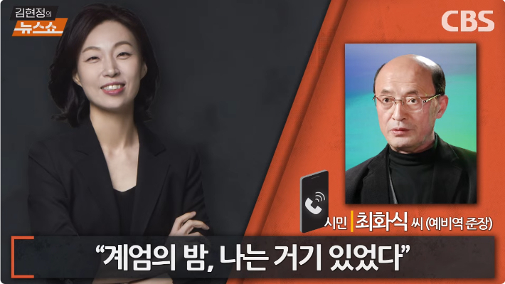 ◇ 김현정> 12. 3 특집으로 함께하고 있습니다. 김현정의 뉴스쇼 오늘 2부는요. 작년 오늘 그 긴박했던 밤 온몸으로 불법 계엄을 막아냈던 주역들의 목소리 들어볼 겁니다. 시민 한 분 그리고 여야의 정치인 한 분씩을 차례로 만나보죠. 먼저 계엄 선포 기자회견을 듣자마자 한걸음에 국회로 달려간 시민들 가운데 한 분입니다. 최화식 육군 예비역 준장 연결이 돼 있습니다. 최화식 준장님, 나와 계십니까?