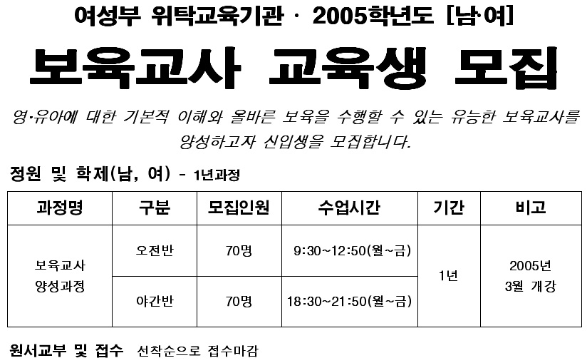 보육교사 양성과정 | 오전반 | 70명 | 9:30~12:50(월~금) | 1년 | 2005년 3월 개강 |