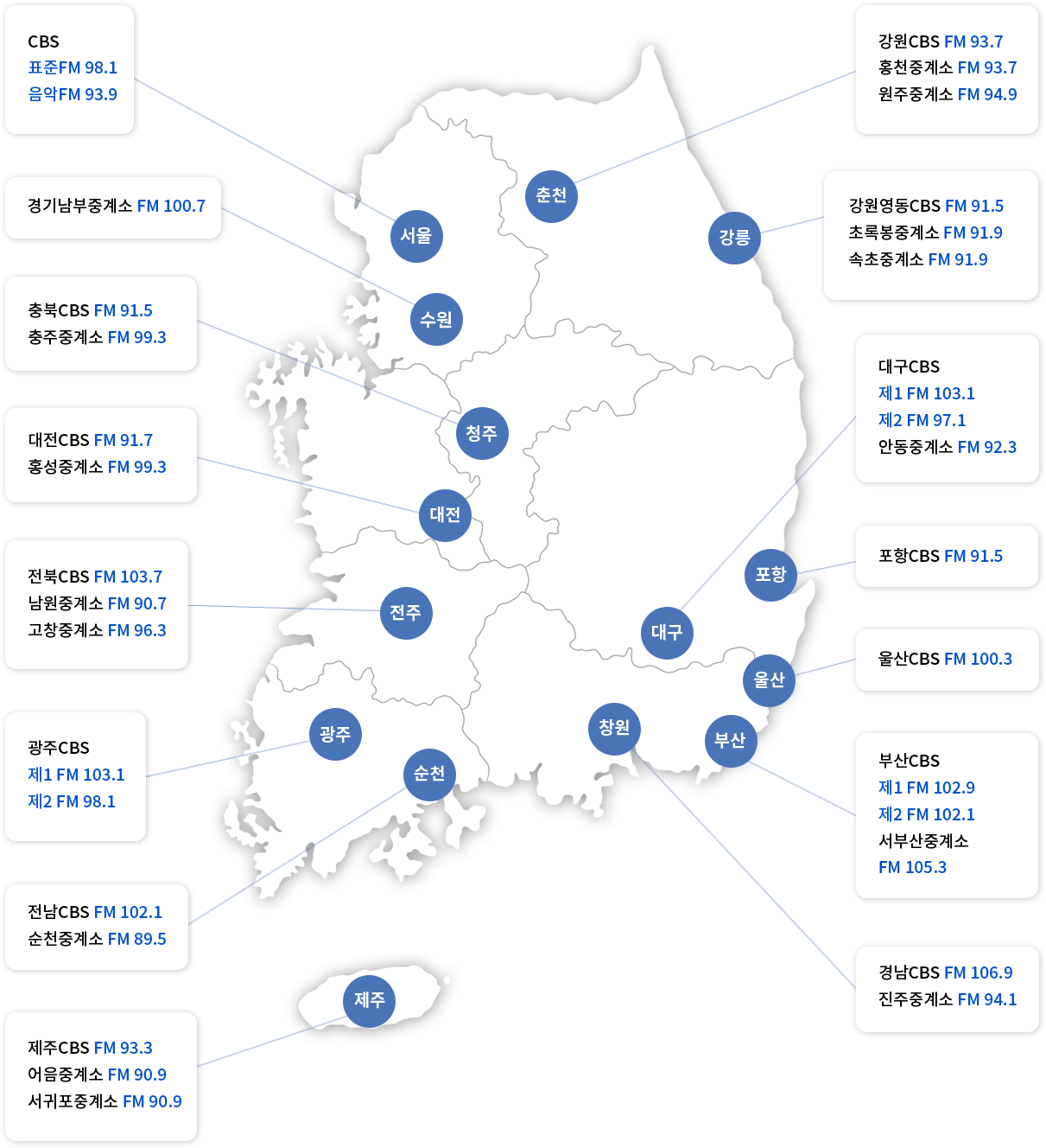 | 제주CBS | FM 93.3 어음중계소 FM 90.9 서귀포중계소 FM 90.9 | 2001년 6월 12일 | 제주특별자치도 제주시 과원북 2길 1 | 064-748-7400 |