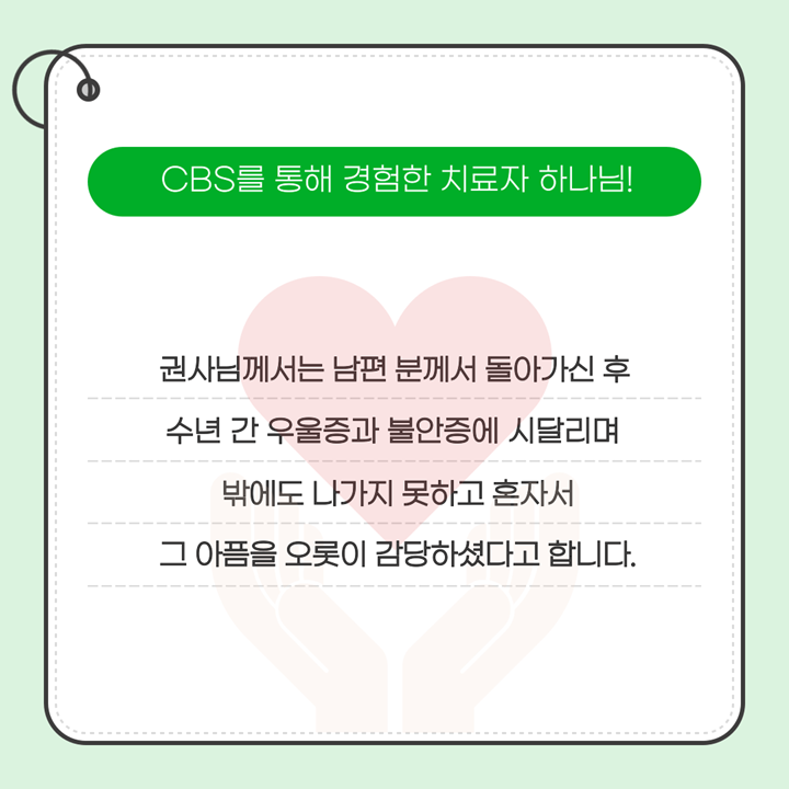 권사님께서는 남편 분께서 돌아가신 후 수년 간 우울증과 불안증에 시달리며