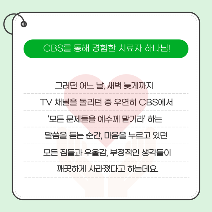 우연히 CBS에서 흘러나오는 '모든 문제들을 예수께 맡기라'하는 말씀을 듣는 순간,